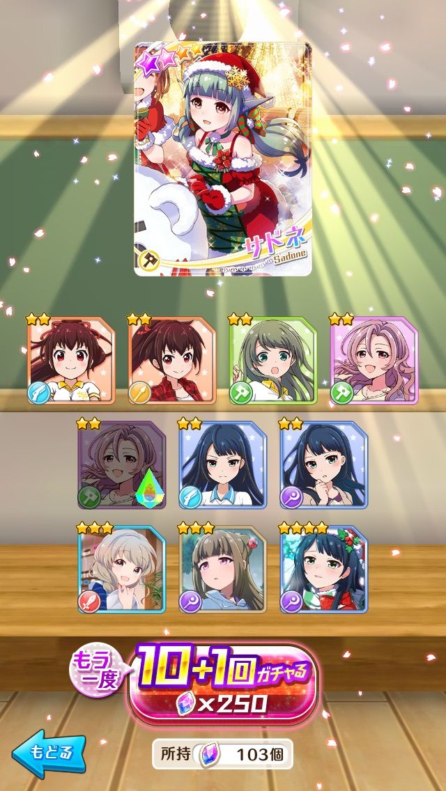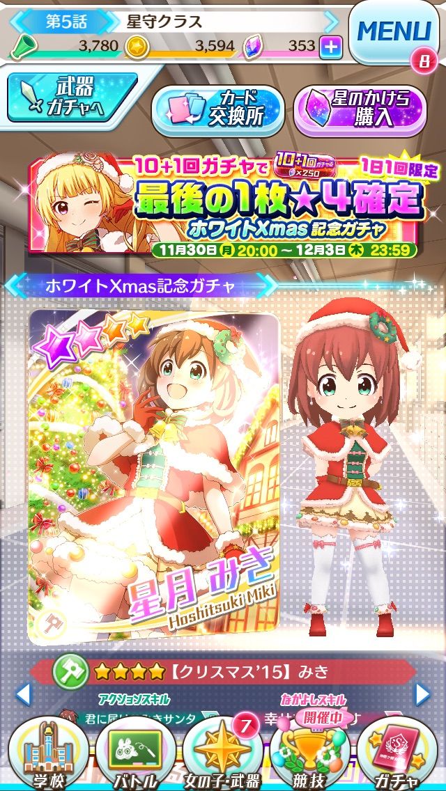 んで、『白猫』と同じ日にこのゲームでも11月30日(月)からクリスマスガチャが開始されています。なんと1日1回限定で、「11連ガチャを引いたら☆4キャラが1枚確定」という激熱なキャンペーンが実施されているんです。『白猫』も見習ってほしいですね(・・・たしか韓国版あたりで同じ仕様が・・・)。