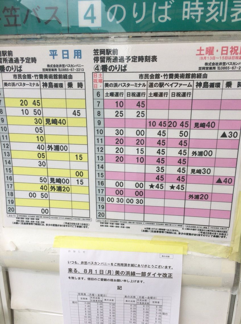 カブトガニ博物館に向かうバスは、駅前の4番乗り場から向かうことができます。時刻表の「平日用」「神島循環」のバスのみが「カブトガニ博物館前」に停まるバスなわけですが・・・なんと一日に4本しかありません。さすがクソ田舎・・・あ、いや、岡山は大都会のはずなのにおっかしいなぁ。