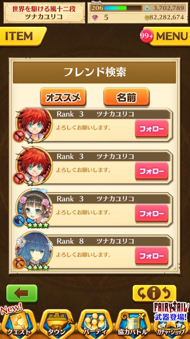 ちなみに、スマホゲームで他に「ツナカユリコ」の名前でプレイしている人がいないか気になったんで、『白猫』で調べてみたんだけどさ・・・