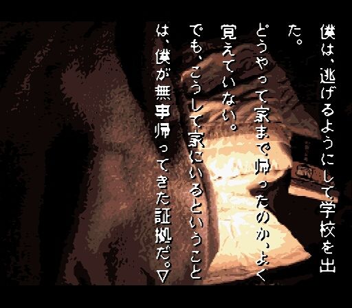 当時の粗いグラフィックなのがまたええんよな。現在でこれをやってしまうとシュールさが溢れてしまうからなぁ・・・『四十八(仮)』しかり、『ク●ーズド●イト●ア』しかり・・・