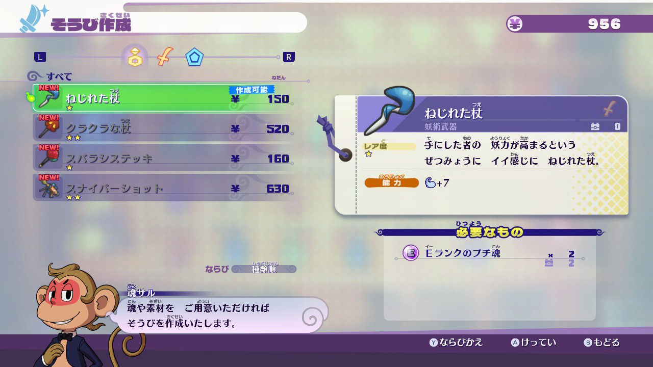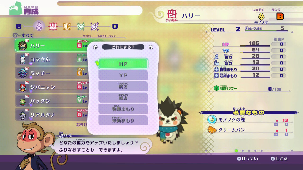 手に入れた魂を使って妖怪を仲間にできる以外にも、ともだち妖怪を強化したり、装備品を作成したり、装備品をグレードアップさせたりと、色々なことができるみたいだね