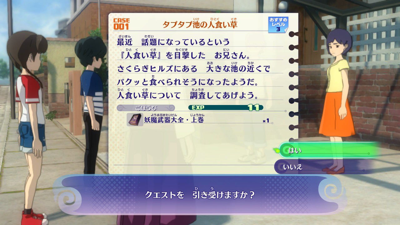 ナツメは「妖怪探偵団」のアキノリ、トウマと合流して探偵活動開始!「クエスト」をこなしながら、街中で妖怪に困らされている人たちを助けていくよ!