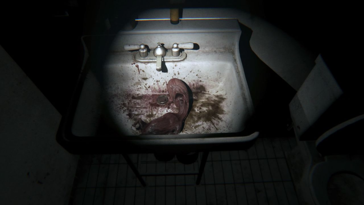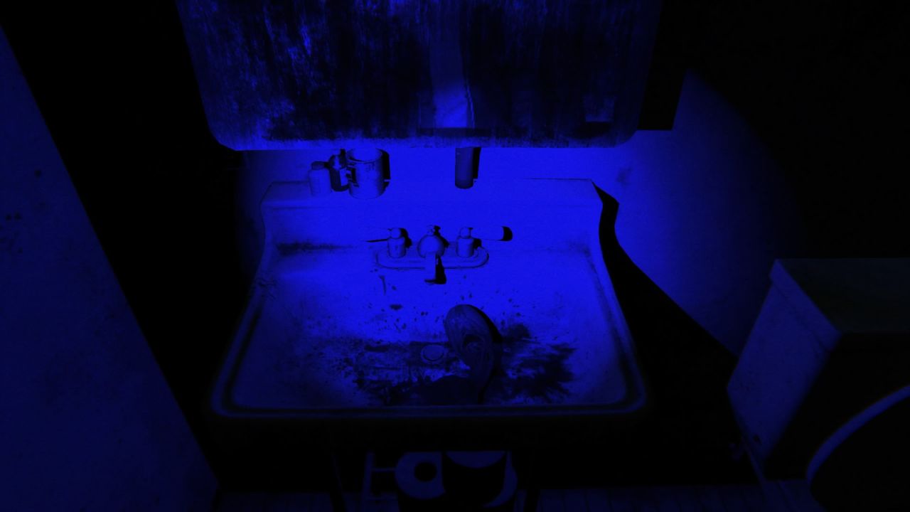 この中はバスルームじゃ。地面に落ちている懐中電灯を拾って、洗面器を見て見ると・・・