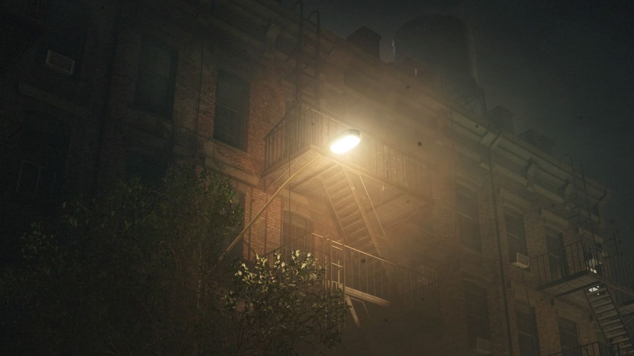 無限ループから抜け出して、ようやく主人公が屋外へ・・・いままで一人称視点だったし、洗面台の鏡も汚くてよく確認できなかったけど、ようやく主人公の姿が明らかになるってわけか