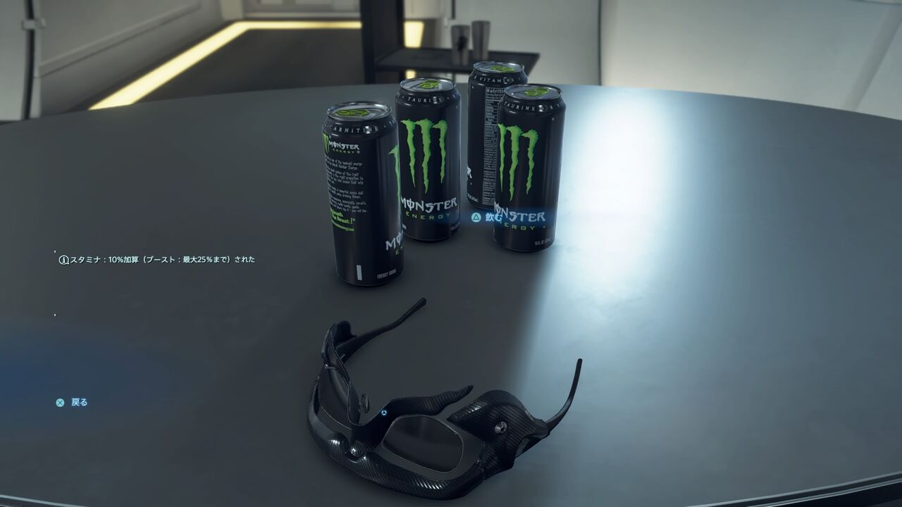 タイアップと言えば、「モンスターエナジー」を飲むこともできるよ。飲めばスタミナの最大値がアップするぞ