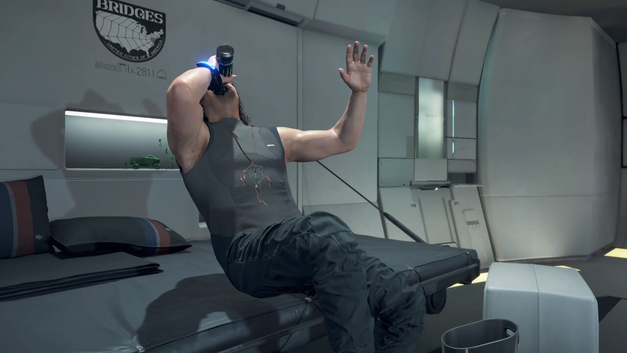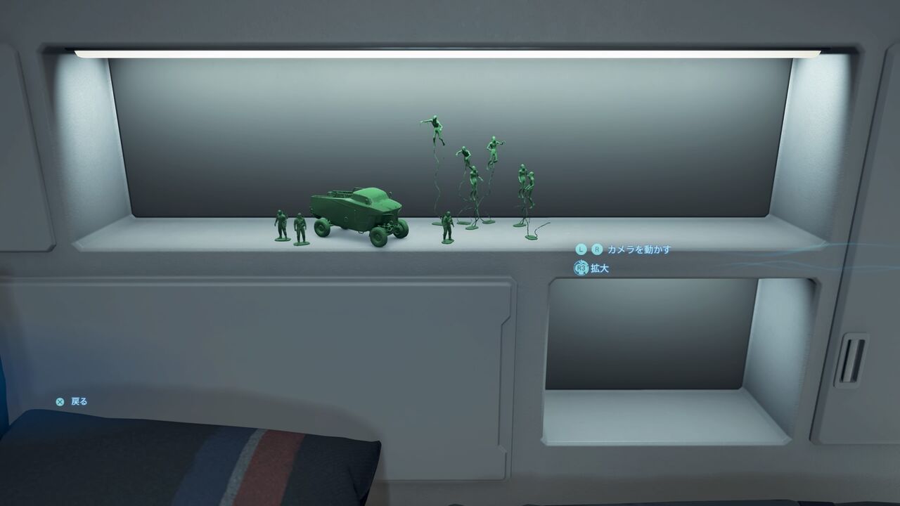 ちなみに小島監督作品らしいお遊び要素も色々とあります。例えばプライベートルームではシャワーを浴びたり、排泄したり、フィギュアを眺めたり、音楽を聴いたり・・・なんてことも