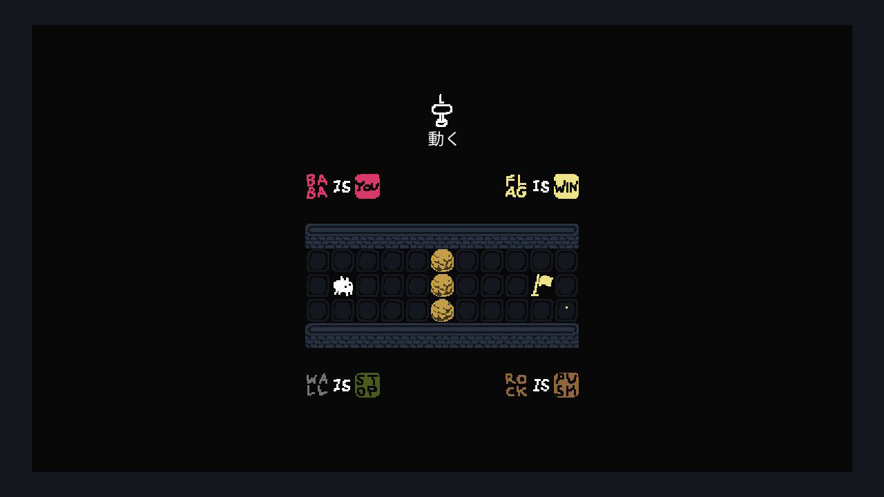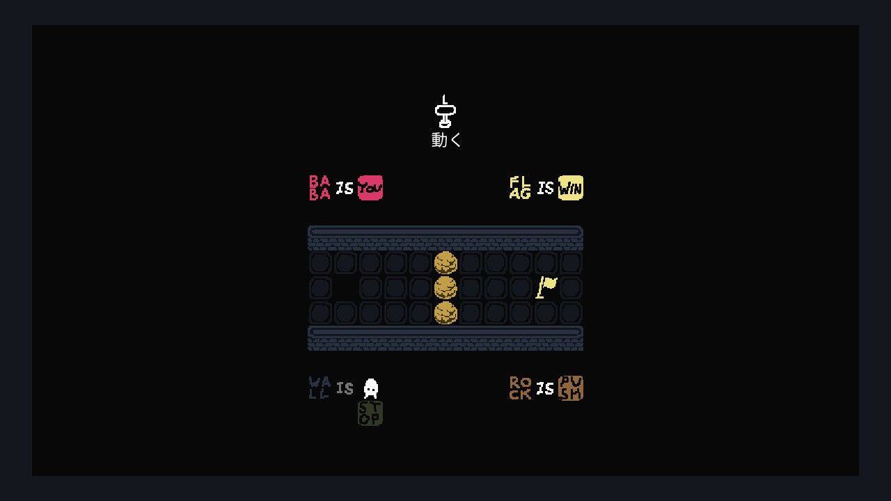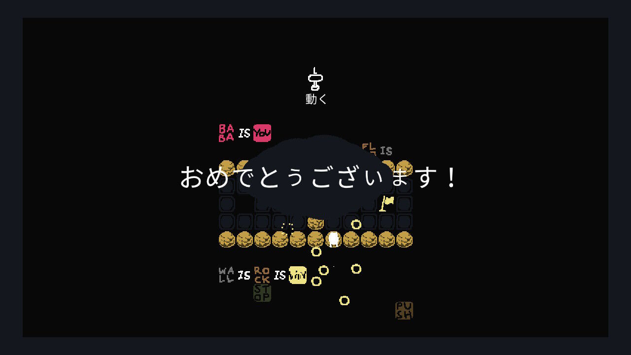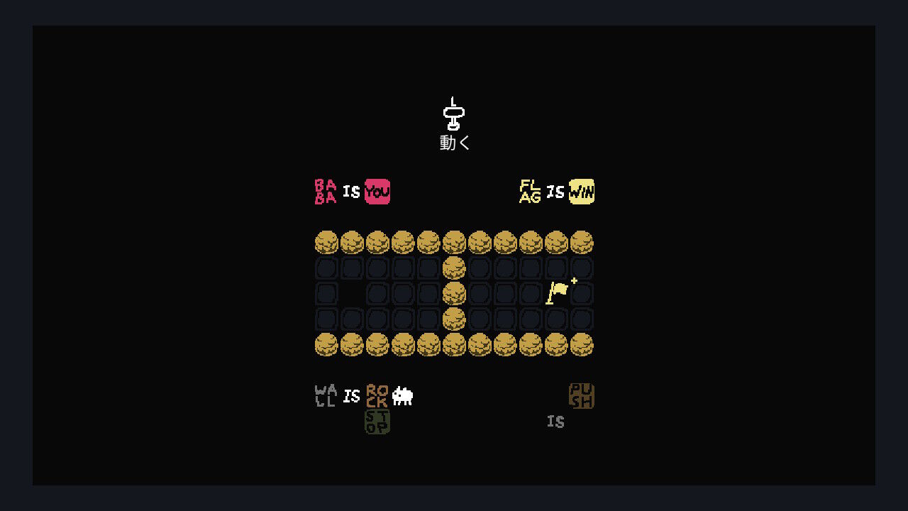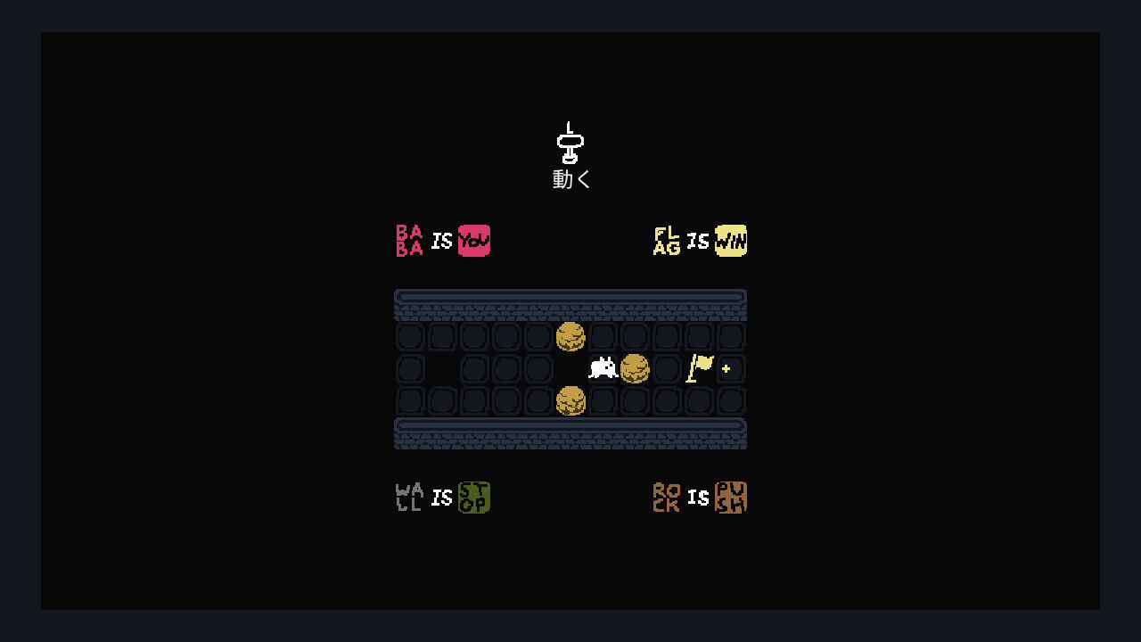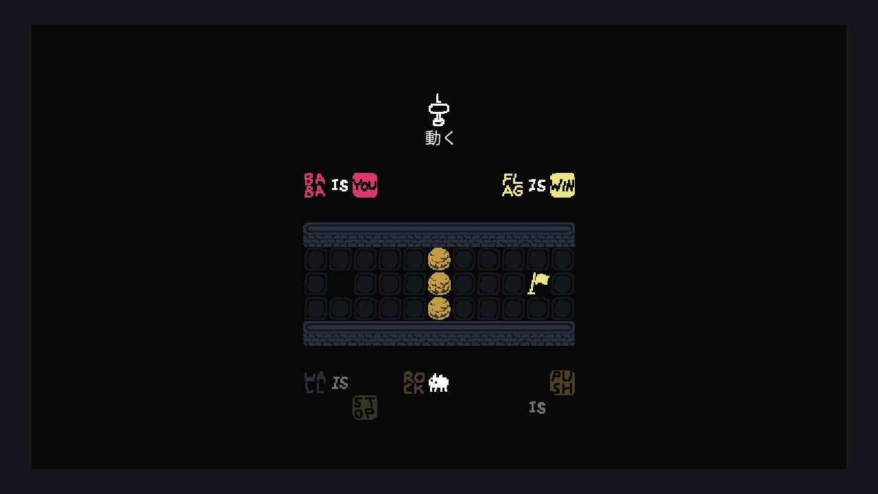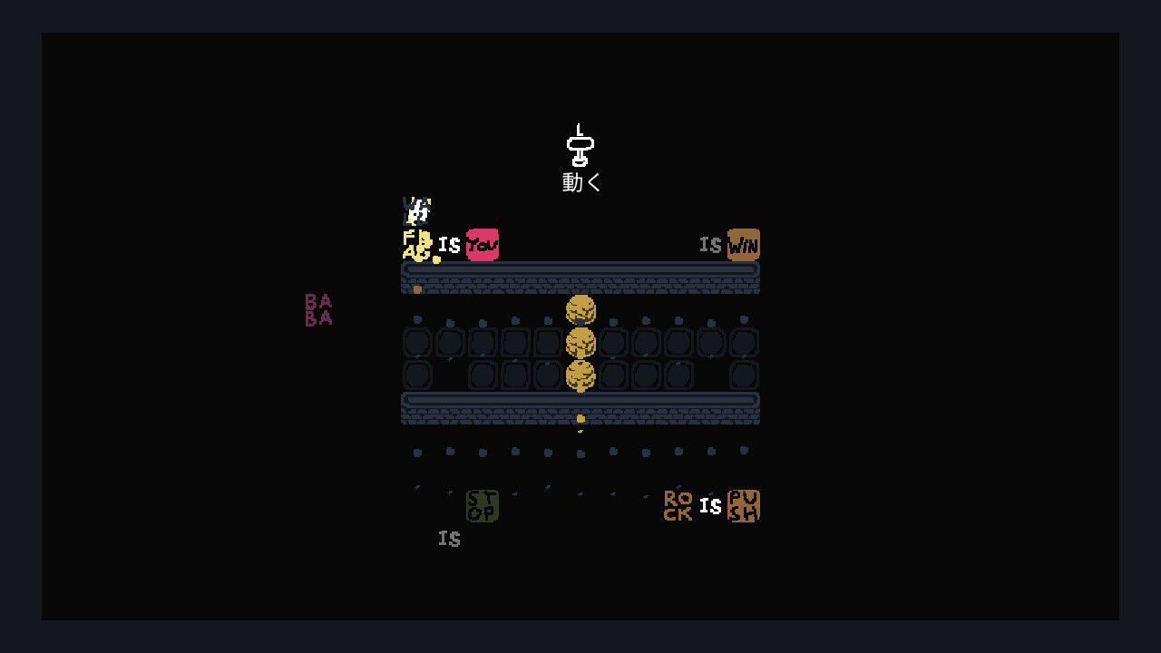 さらに「ROCK IS WIN」としてしまえば、「岩に触れることでクリア」ってルールに書き換わる。シンプルそうに見えて、このチュートリアルステージだけでいくつもの解法が存在するわけだよ