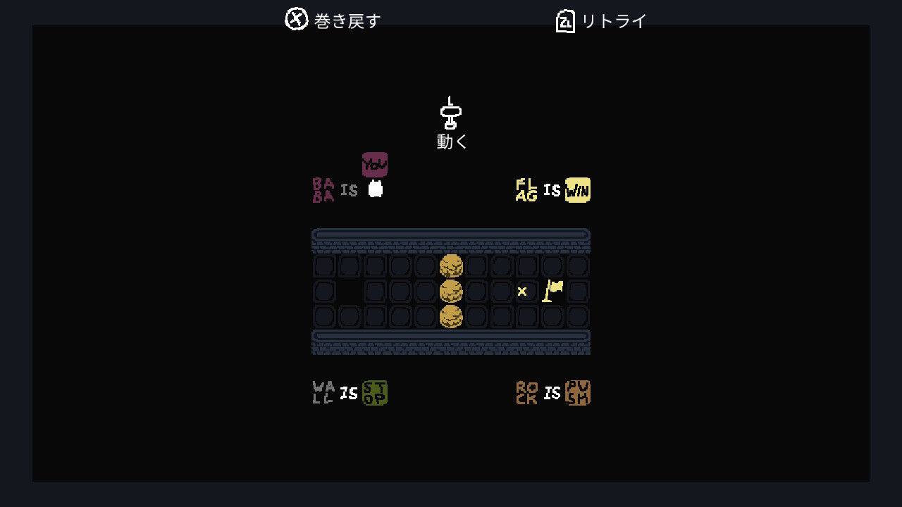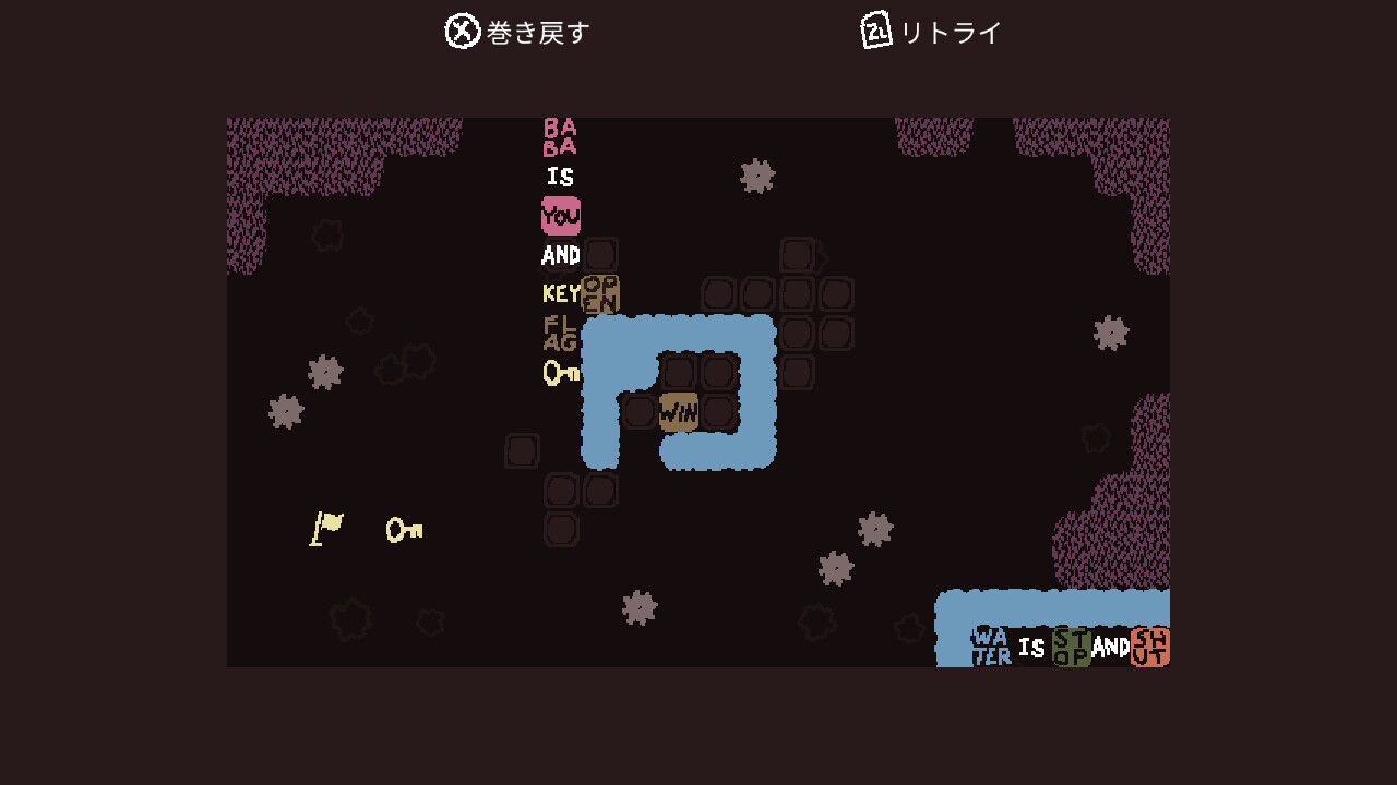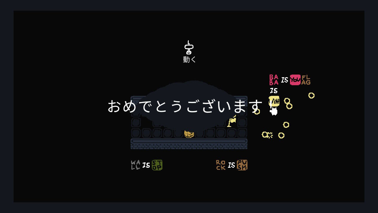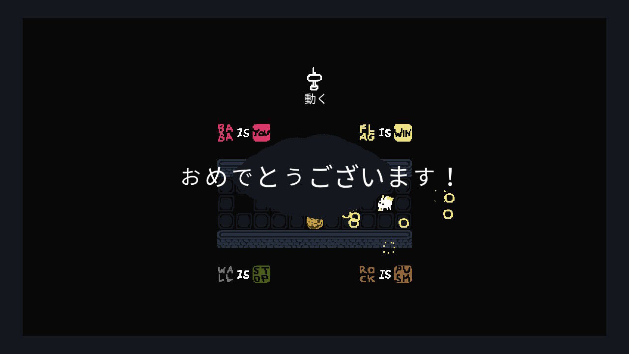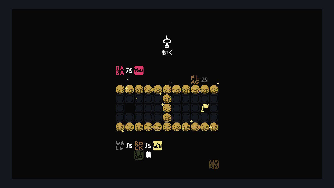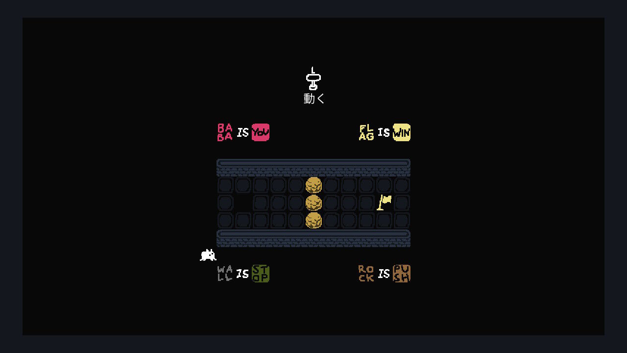 さらに「ROCK IS WIN」としてしまえば、「岩に触れることでクリア」ってルールに書き換わる。シンプルそうに見えて、このチュートリアルステージだけでいくつもの解法が存在するわけだよ