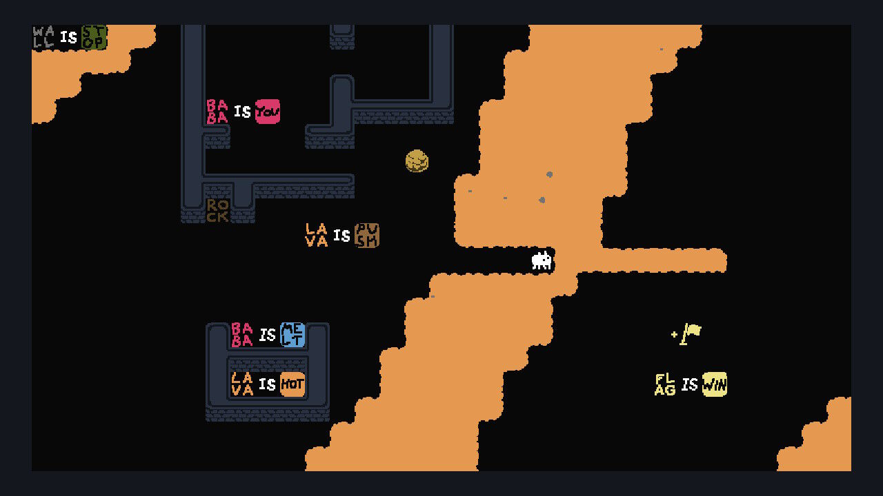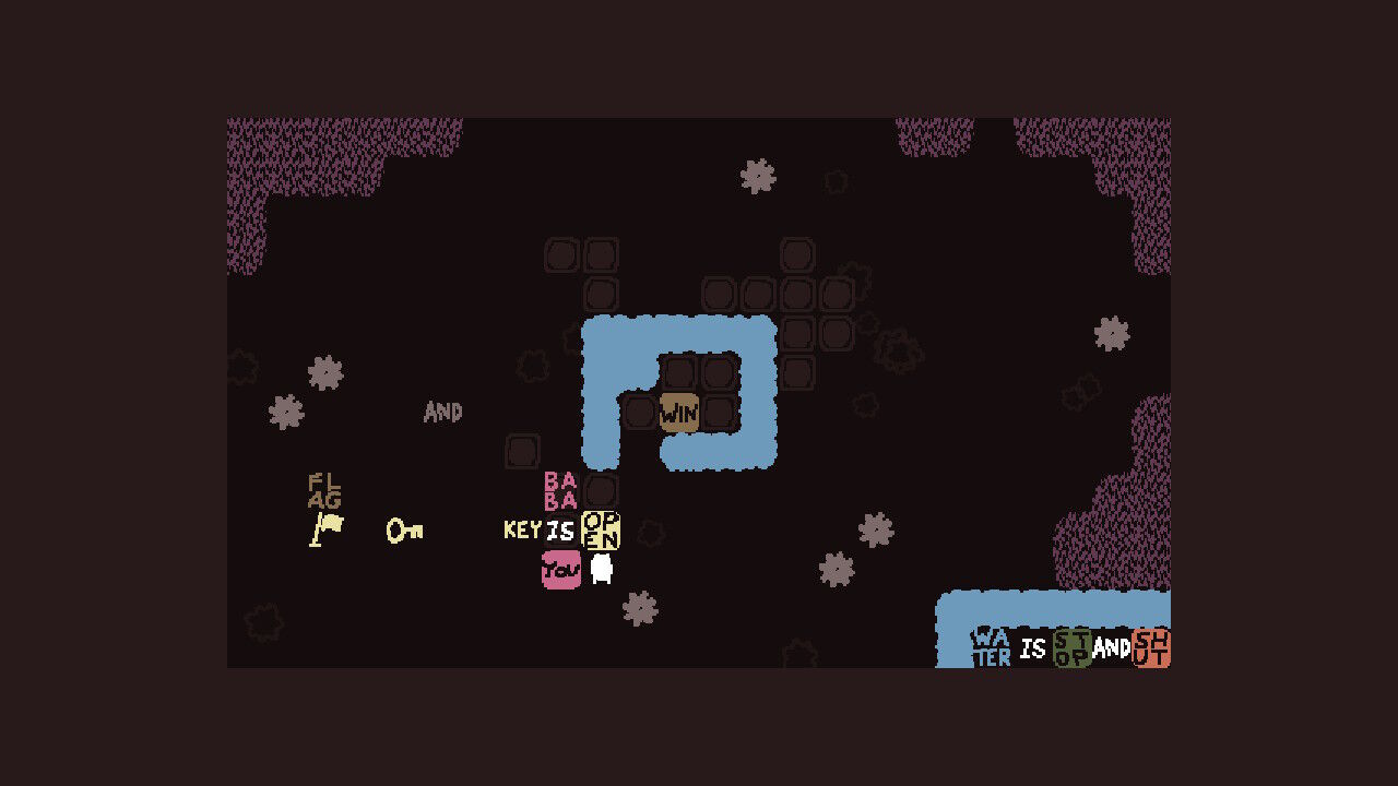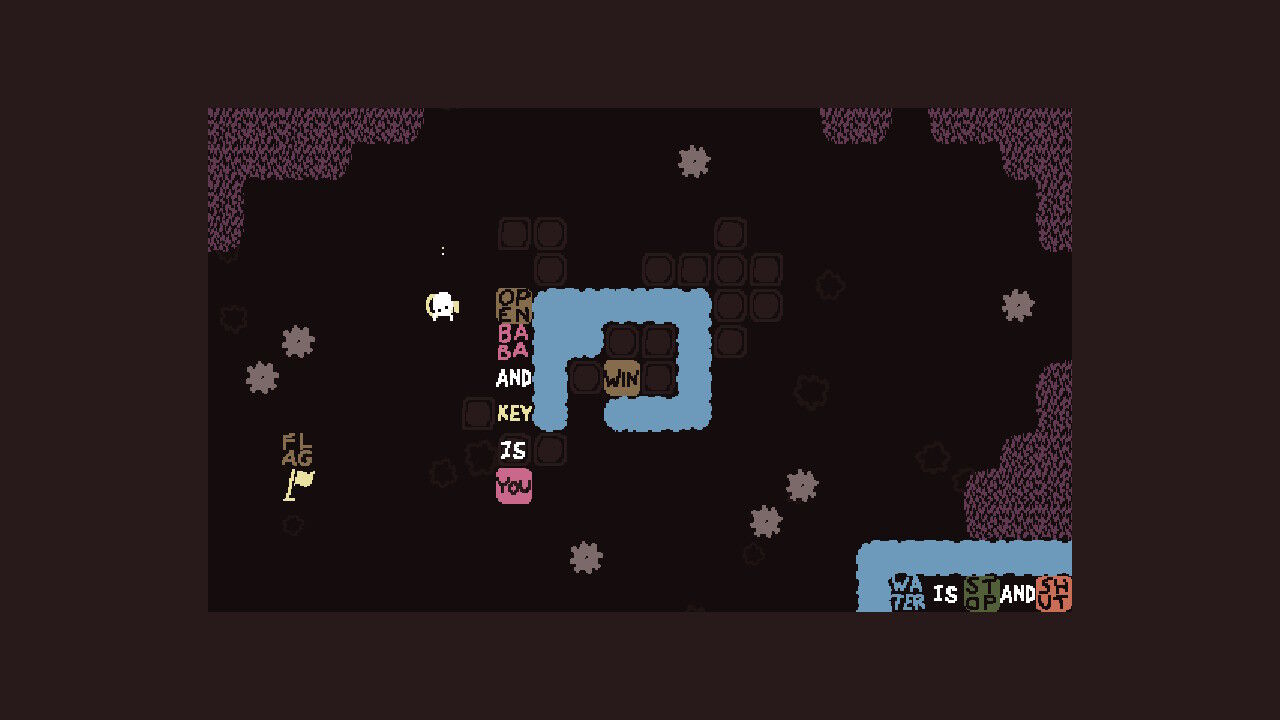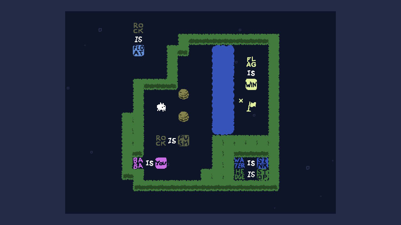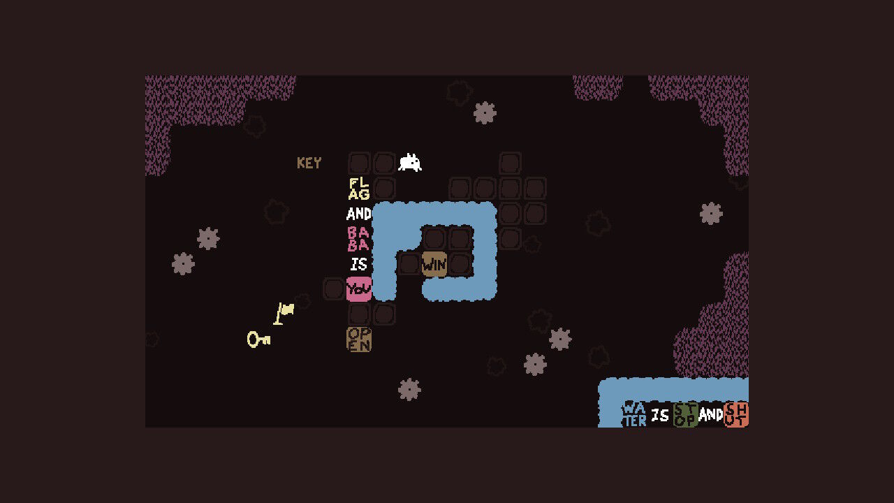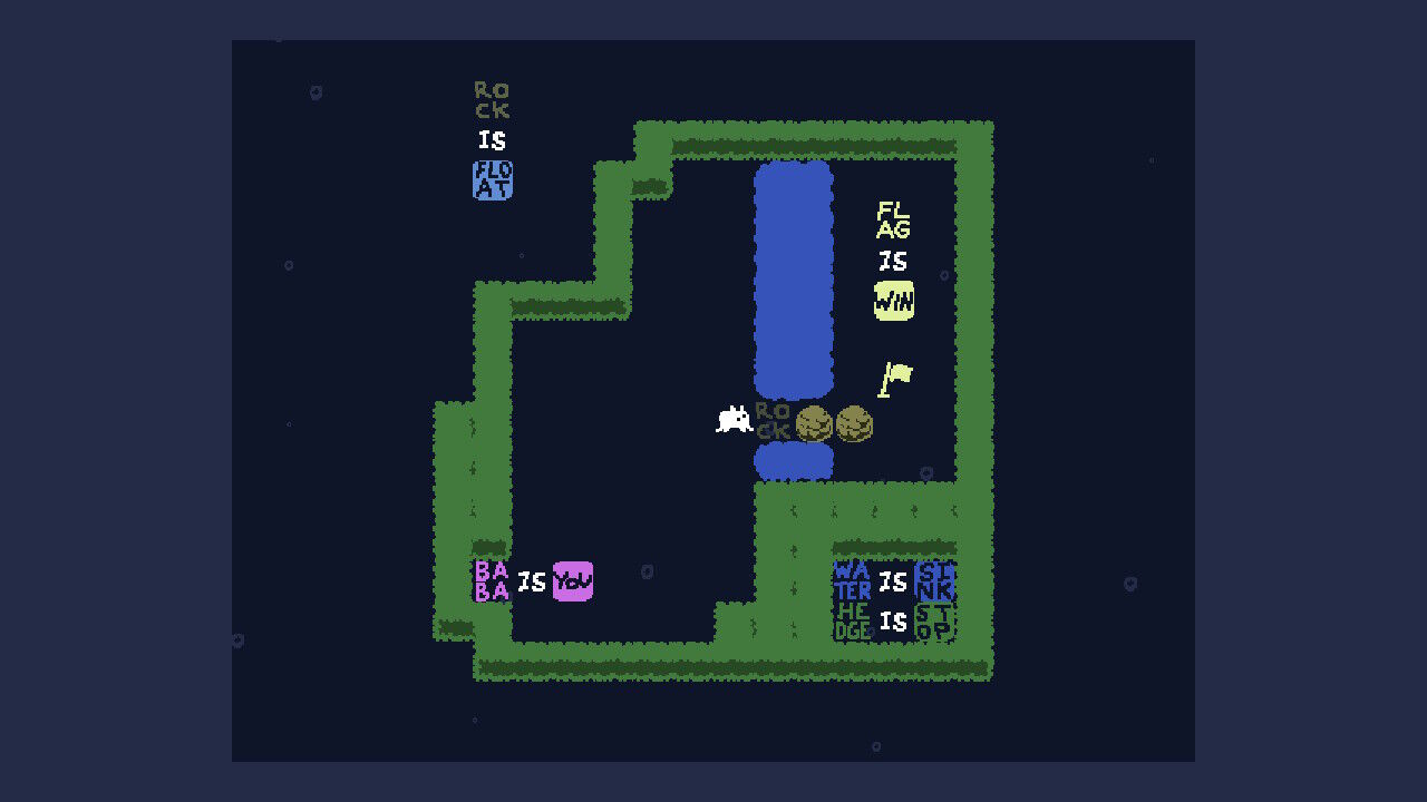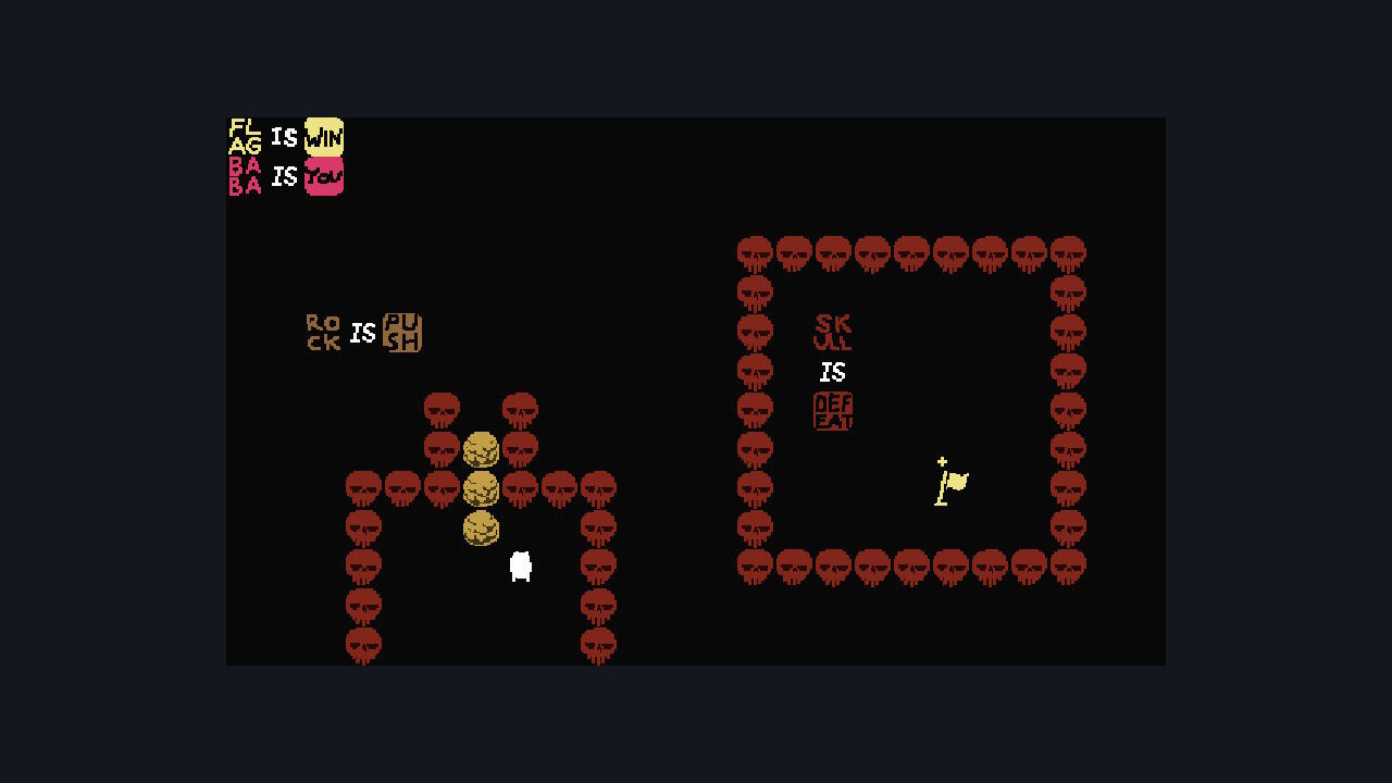 さらに「ROCK IS WIN」としてしまえば、「岩に触れることでクリア」ってルールに書き換わる。シンプルそうに見えて、このチュートリアルステージだけでいくつもの解法が存在するわけだよ