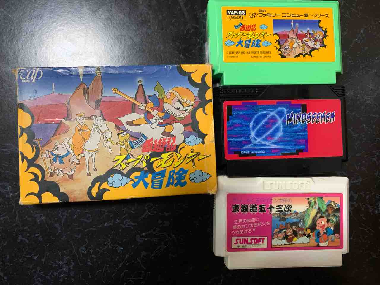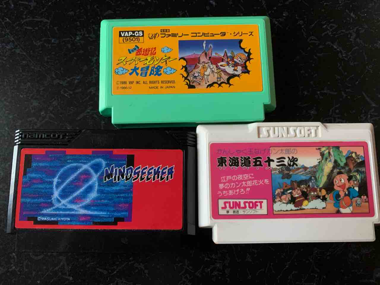 ここに3本のレトロクソゲーを用意しました。『元祖西遊記スーパーモンキー大冒険』『マインドシーカー』『かんしゃく玉投げカン太郎の東海道五十三次』です