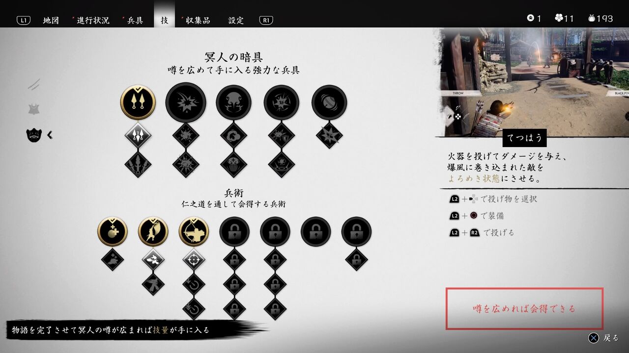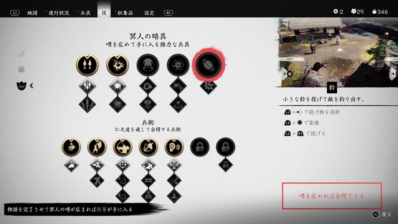 ・・・こんなことなら「鈴」を覚えた方がよかったかも・・・敵をおびき寄せることができるから、めちゃくちゃ闇討が捗りそうだし・・・