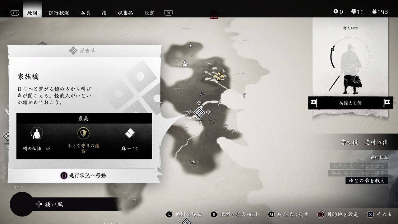 経験値をゲットしたことで、侍としての知名度が「彷徨える侍」に格上げ!最大体力が増えて、暗具「くない」をゲットしたよ!