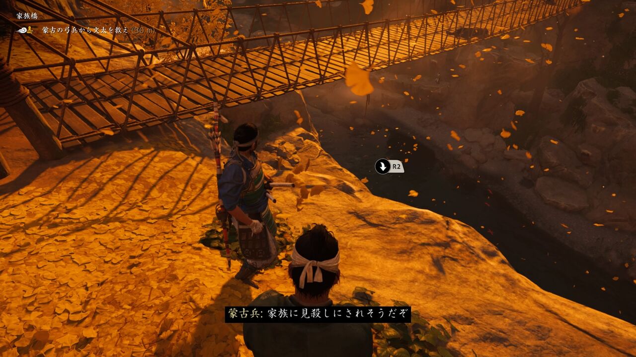 どうやら蒙古どもが、橋の真ん中に取り残された男を弓矢で射って遊んでいる様子・・・ド外道め!
