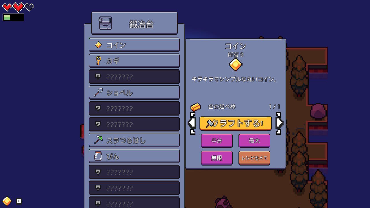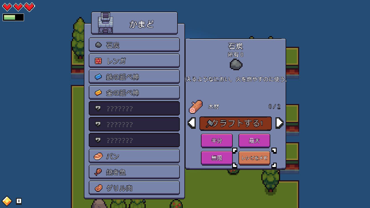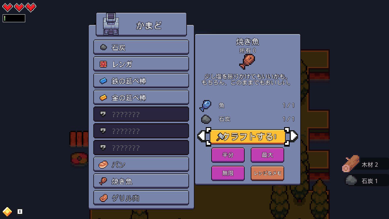 空腹に気をつけながらどんどん素材を集めて、施設や道具を作りまくり、お金が貯まったらエリアを拡張・・・ああ、これ、無限に遊べるゲームじゃないですか・・・