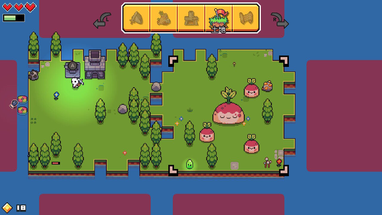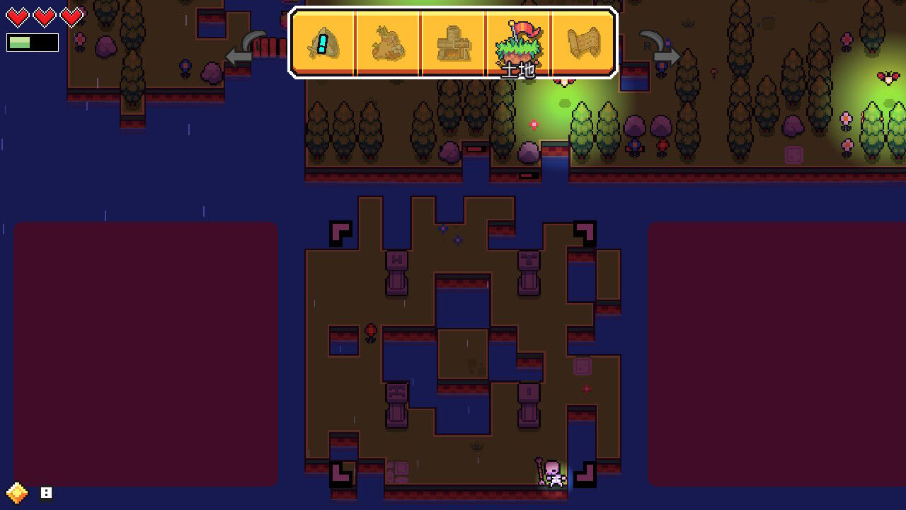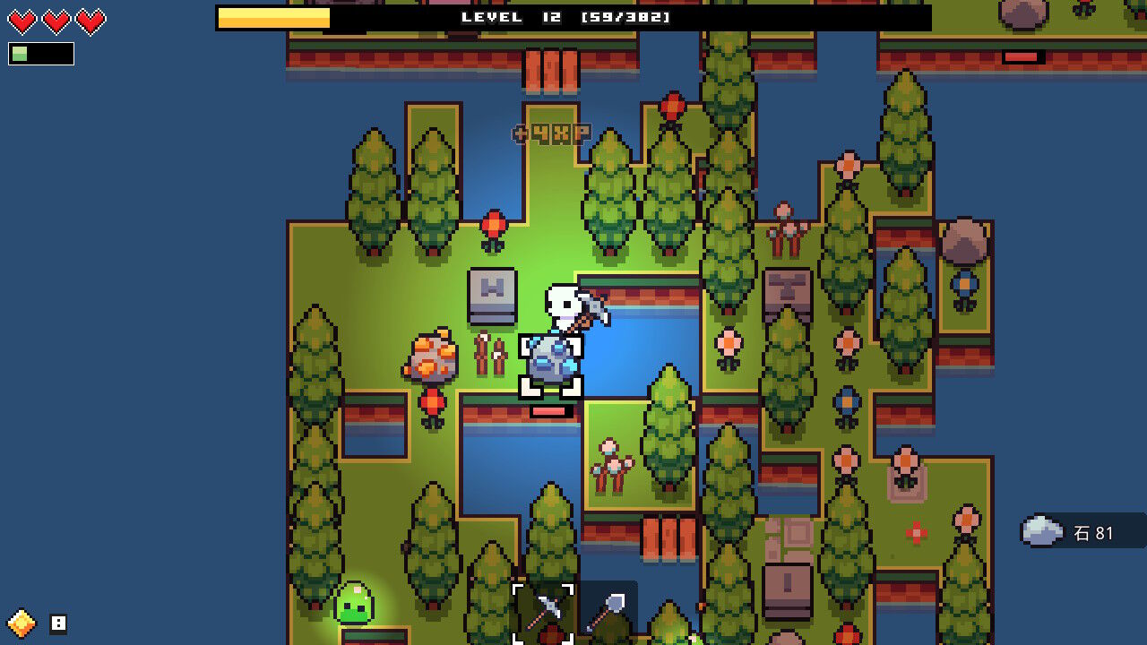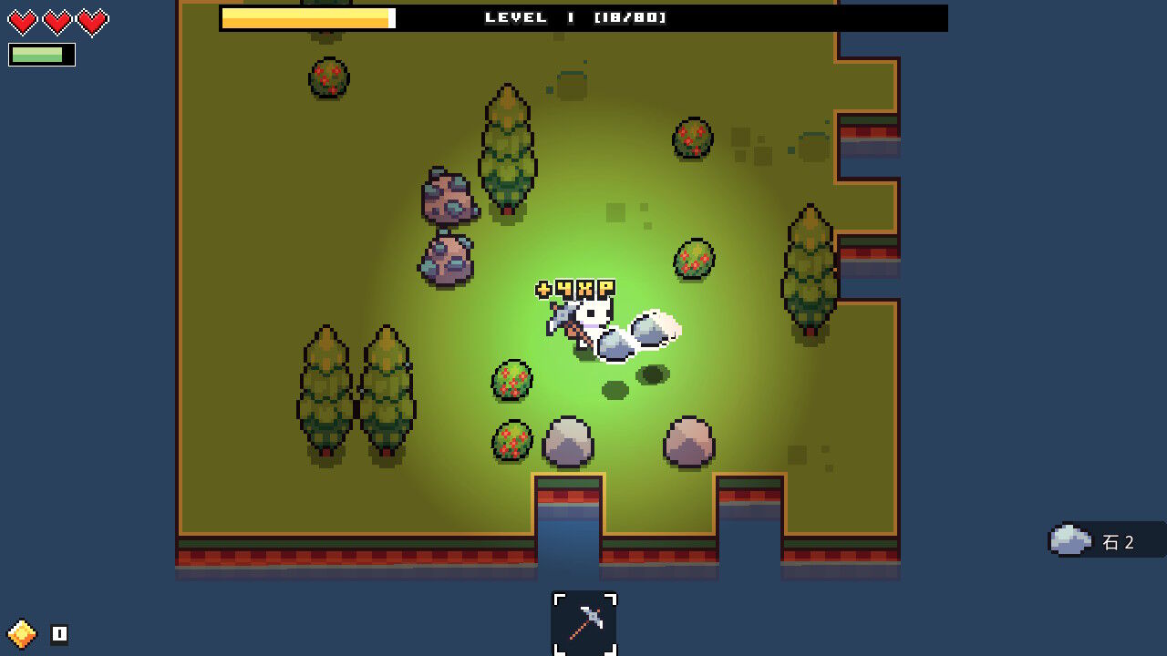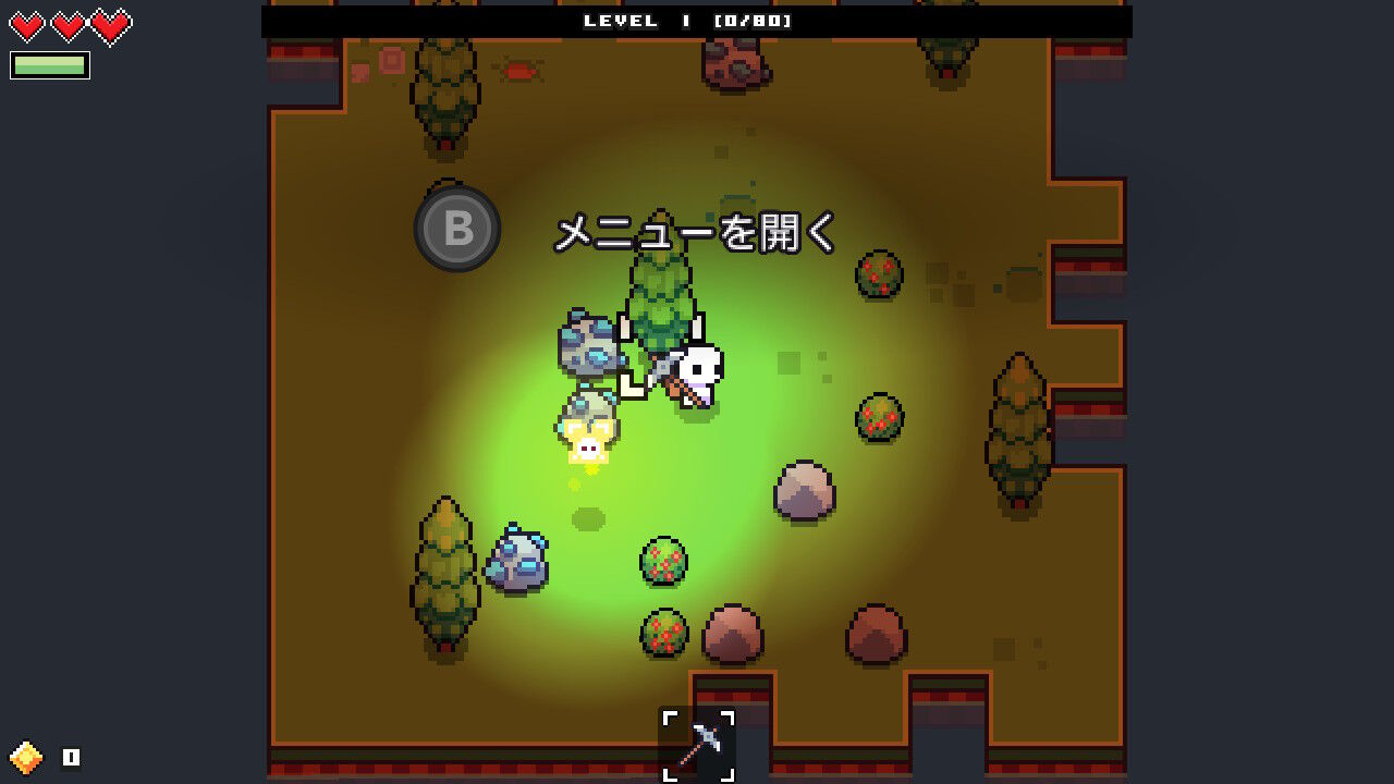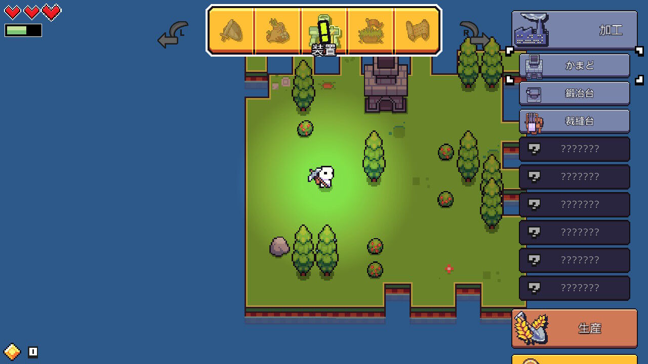 まずは『Forager』という作品から。石や木などの素材を集めつつ、どんどん新しい設備や道具を作成していくサバイバルアクションゲームだよ