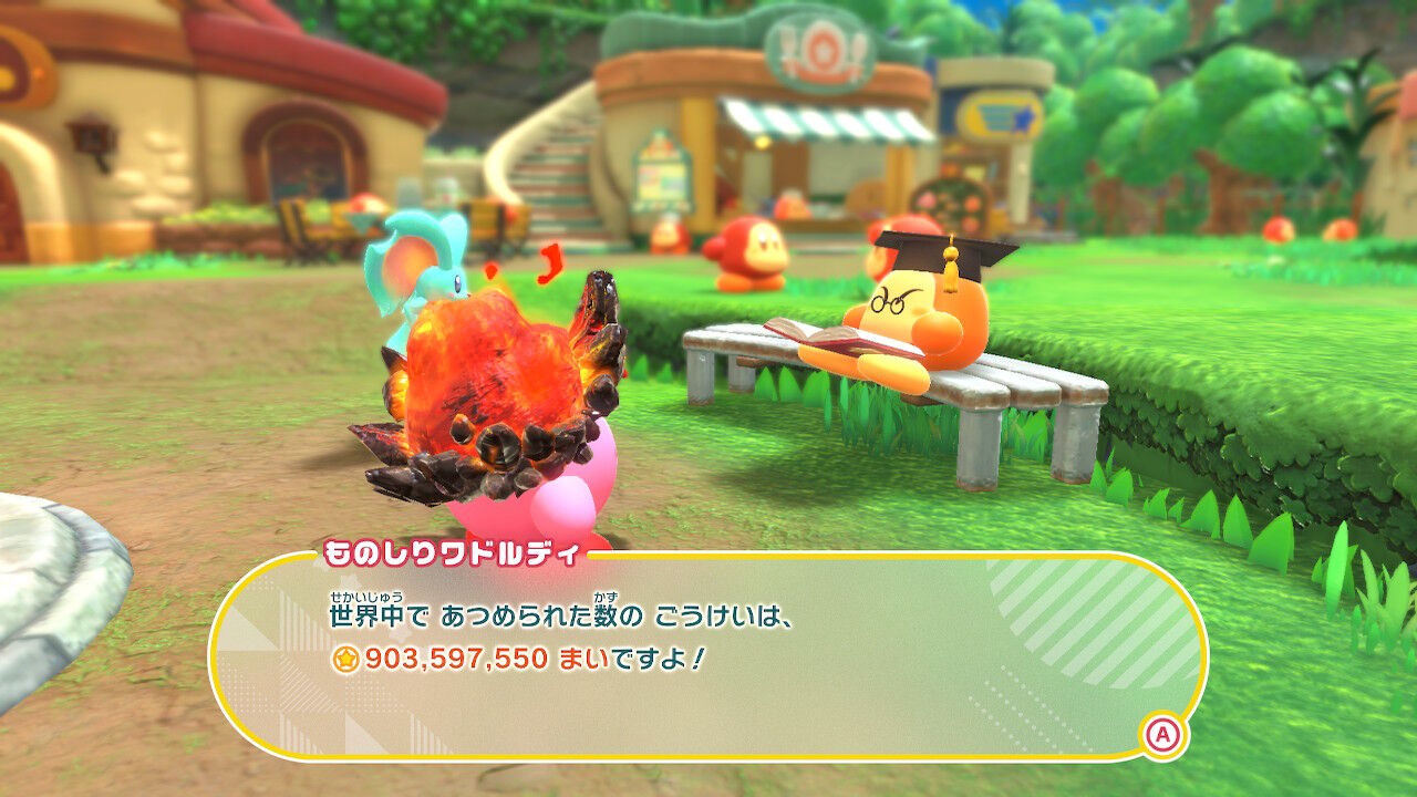 ほかにも、世界中のプレイヤーの記録を教えてくれる「ものしりワドルディ」なんて子も。全プレイヤーが集めた総コイン数とか、ミニゲームの世界記録なんかを知ることができるぞ