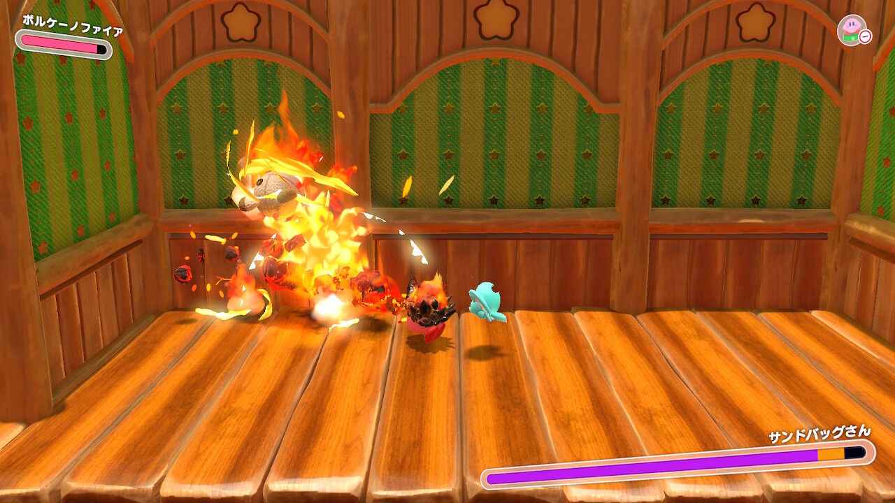 体験版では触れなかったコピー能力「ファイア」を入手!本作では吐いた炎が地面に残り続けて、継続ダメージを与えるよ!