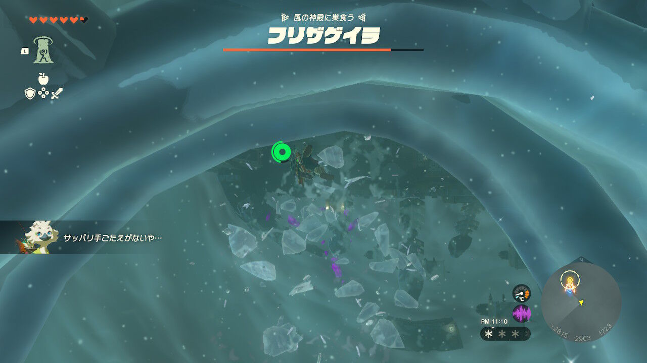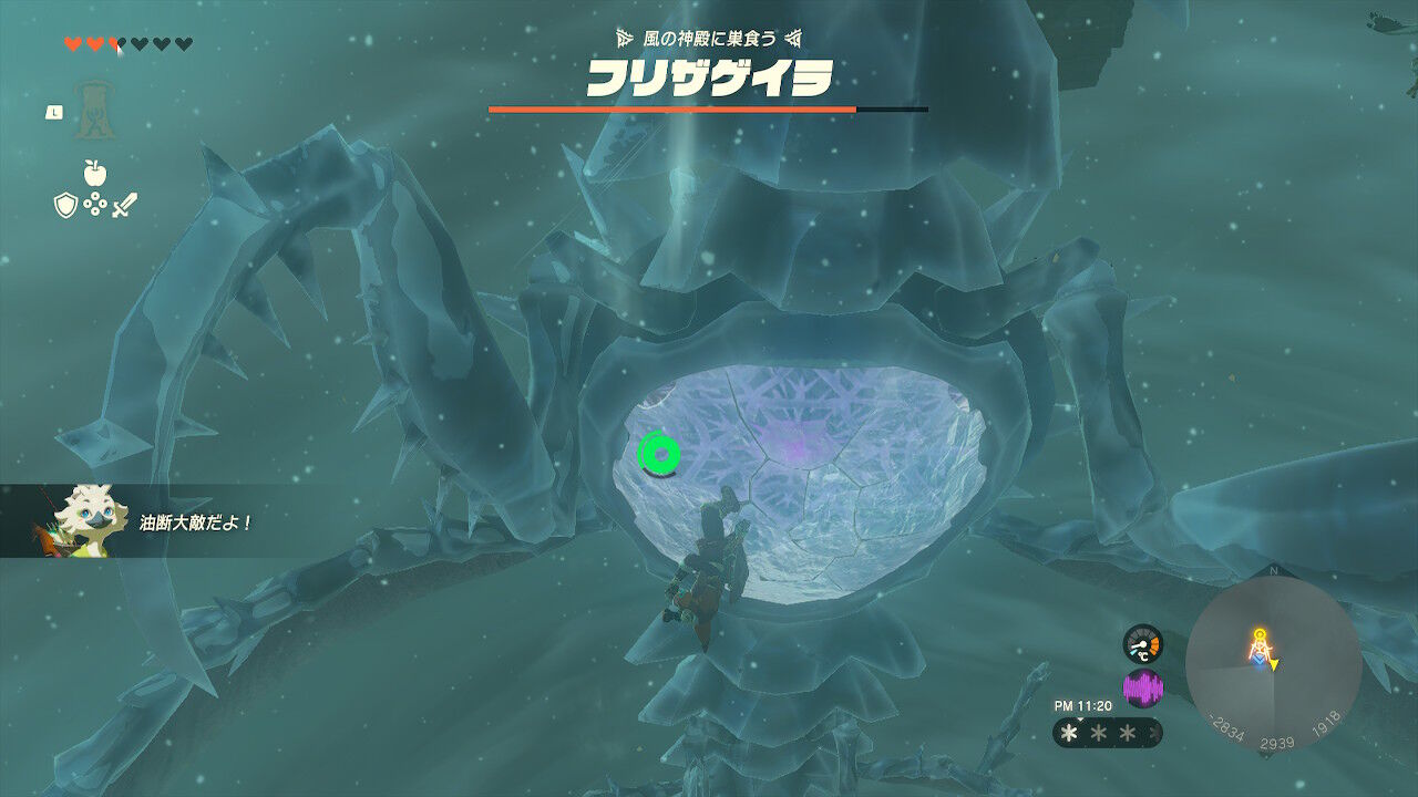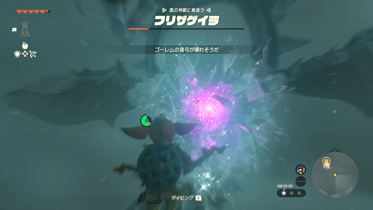 フリザゲイラの弱点は、氷で覆われた紫色のコア。上から降り立って踏み抜くか、弓矢で氷を破壊して射貫くことでダメージを与えられるよ
