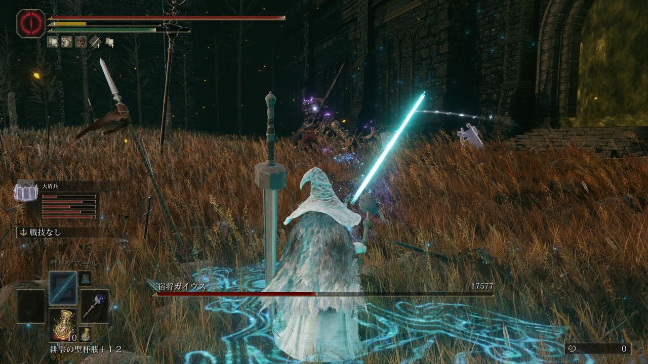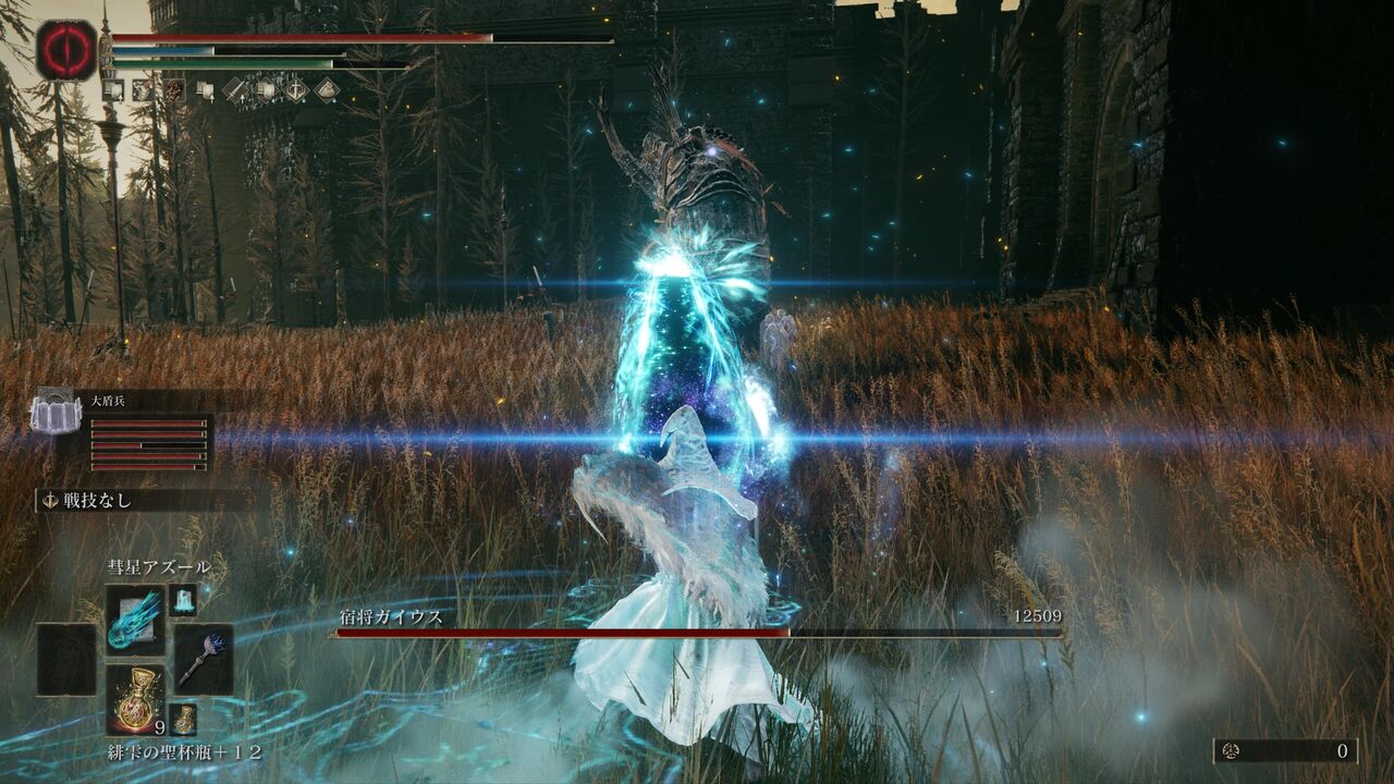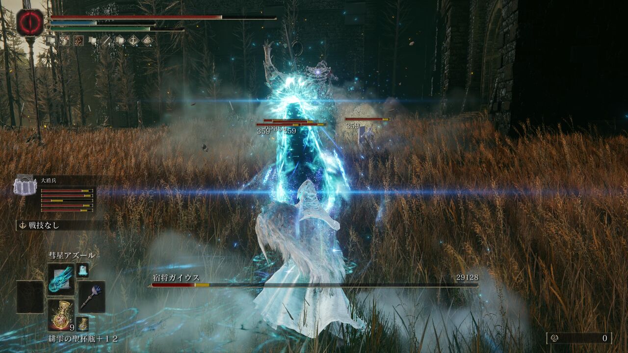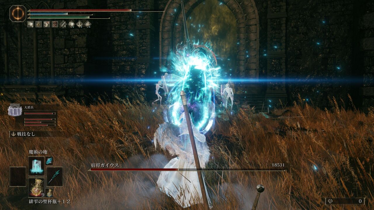 遺灰「大盾兵」にガイウスを引き付けてもらって、魔術の威力が上昇する「魔術の地」を発動!さらにポーションを飲んで、「彗星アズール」で一気に大ダメージ!