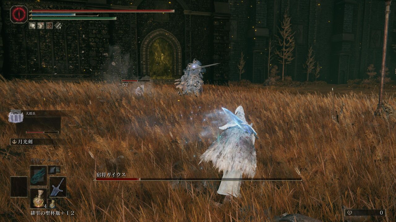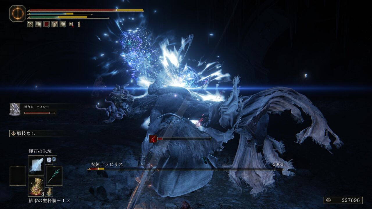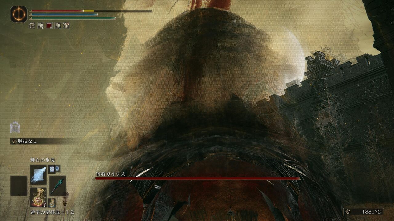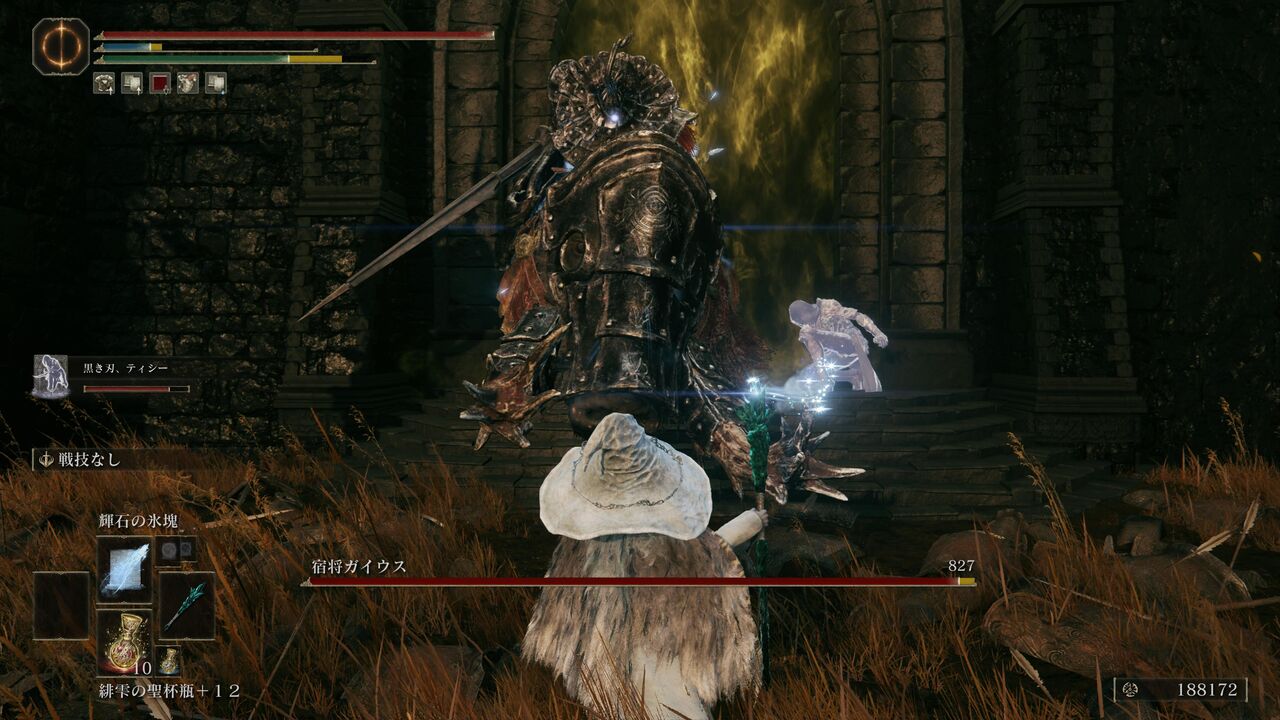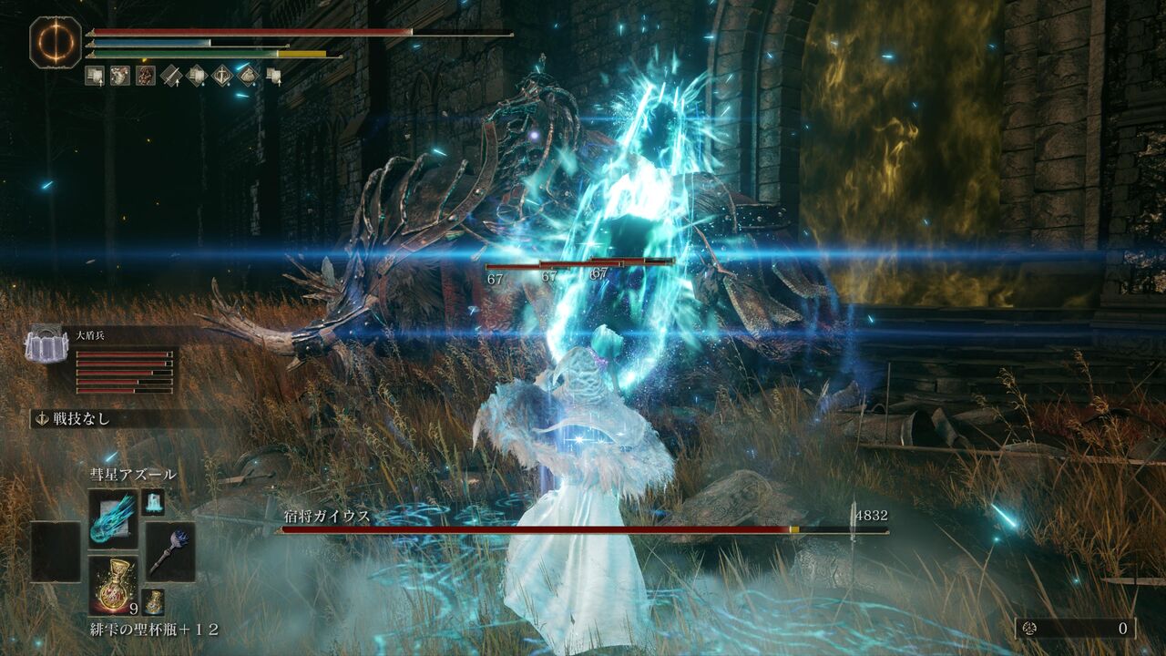 遺灰「大盾兵」にガイウスを引き付けてもらって、魔術の威力が上昇する「魔術の地」を発動!さらにポーションを飲んで、「彗星アズール」で一気に大ダメージ!