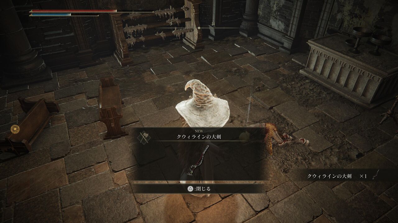 ようやく地獄のジャンプ地帯を突破。礼拝堂みたいな場所で苦しんでいる人がいるから、どこかで拾っておいたアイテムを使ってみるか