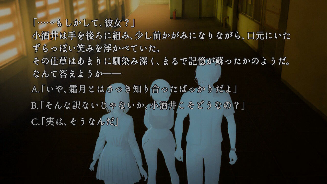 続きましては『神無迷路』。『かまいたちの夜』風な、登場人物たちがシルエットで表現されている推理系アドベンチャーゲームだね