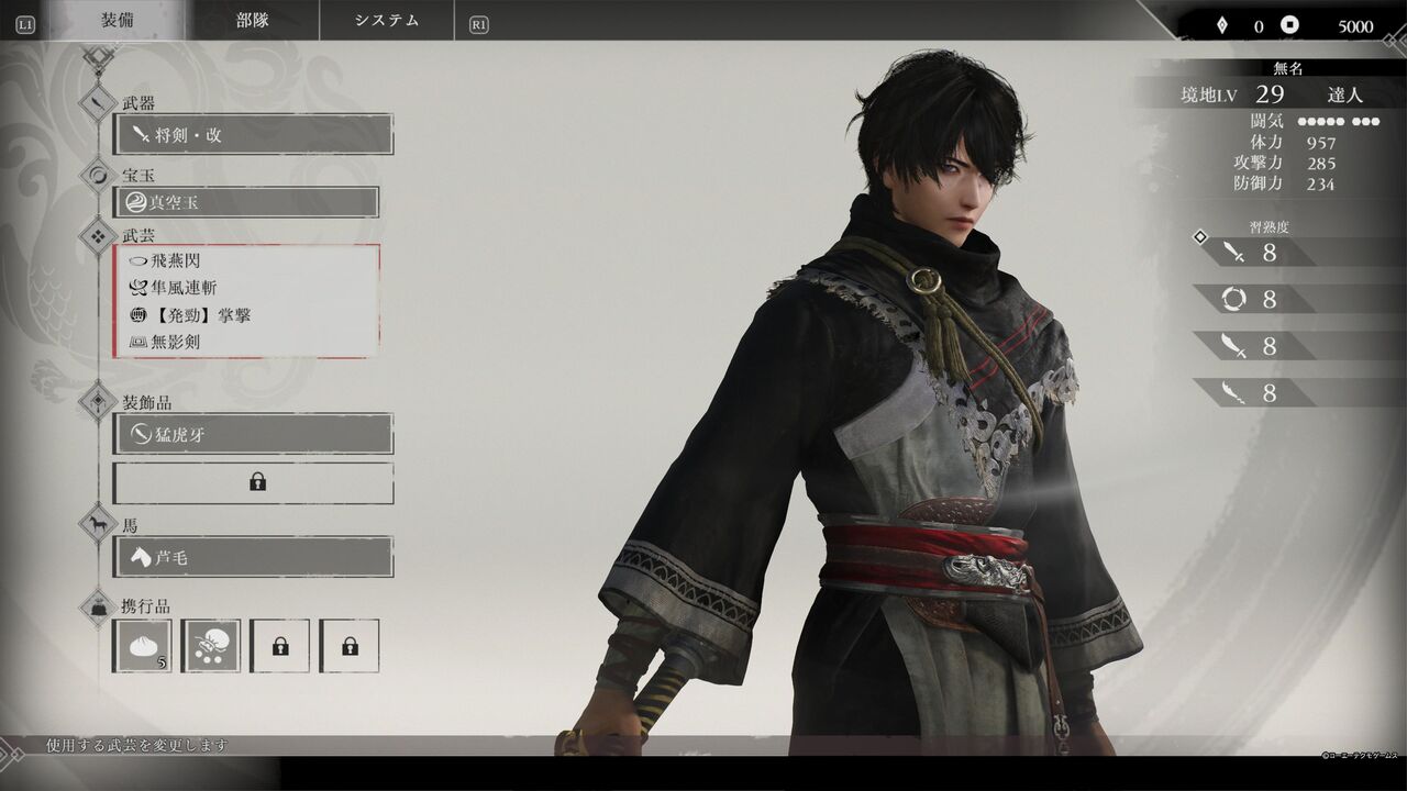 武器や宝玉、装飾品や馬、携帯用消費アイテムを変更できるほか、R1ボタン+○△□×ボタンで発動できる技をカスタマイズできるカンジっすね