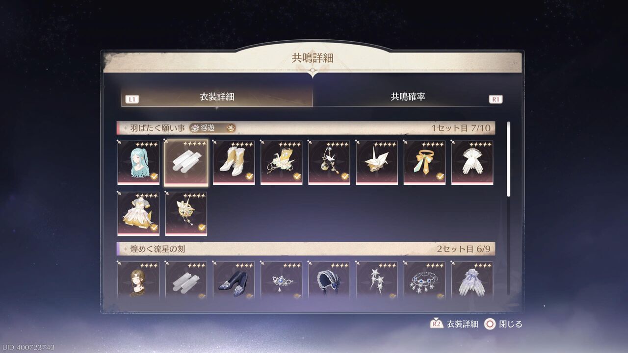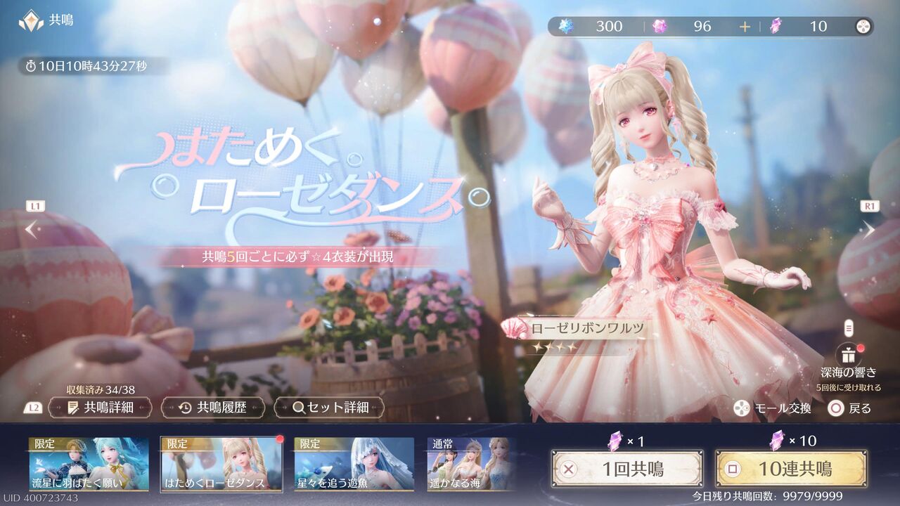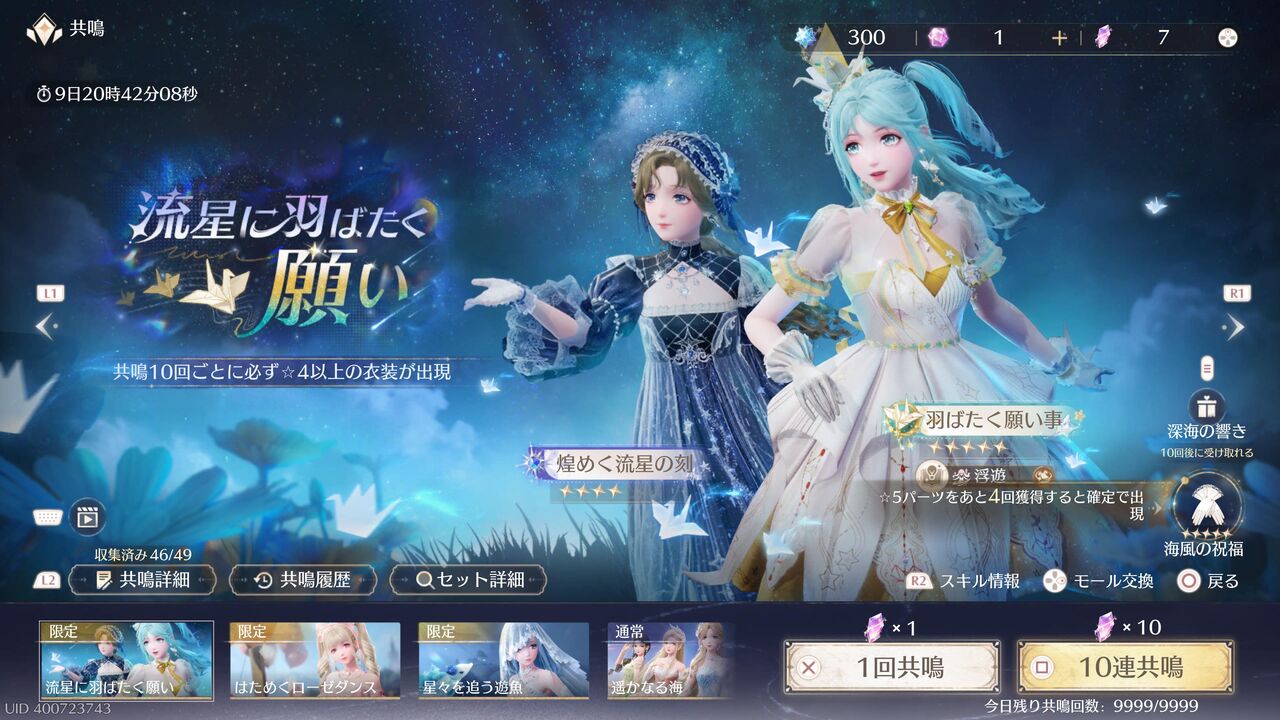 キツめのガチャもあるからね・・・。出てくる衣装は2種類。10連で1パーツ確定、かつ、片方の衣装が揃っても「2セット目」が始まるので、天井はあってないようなもんだよ・・・