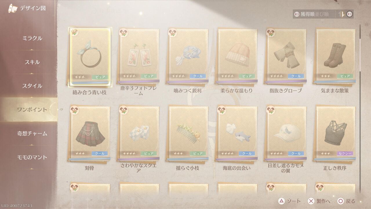 もちろん「着せ替え」要素も充実。各地でデザイン図をゲットして、素材を消費して様々な着せ替えアイテムを作ることができるんだ。素材はちゃんとサーチ機能も付いてるぞ