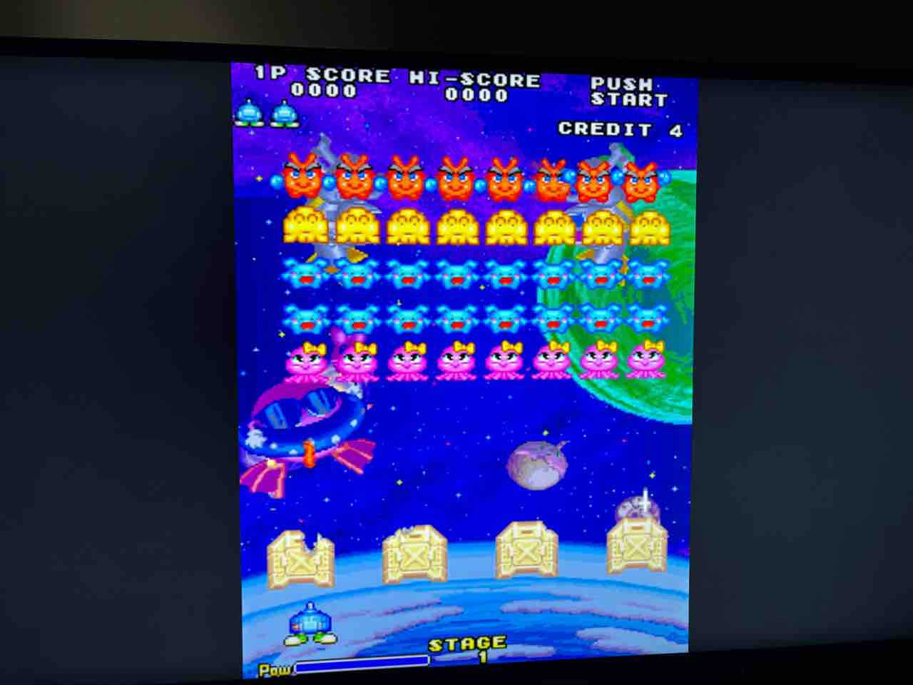 『スペースインベーダー』をベースに、キャラをコミカルにした作品ですね。インベーダーたちが「てってってって」って口で言いながら迫って来るのがカワイイんですよねぇ