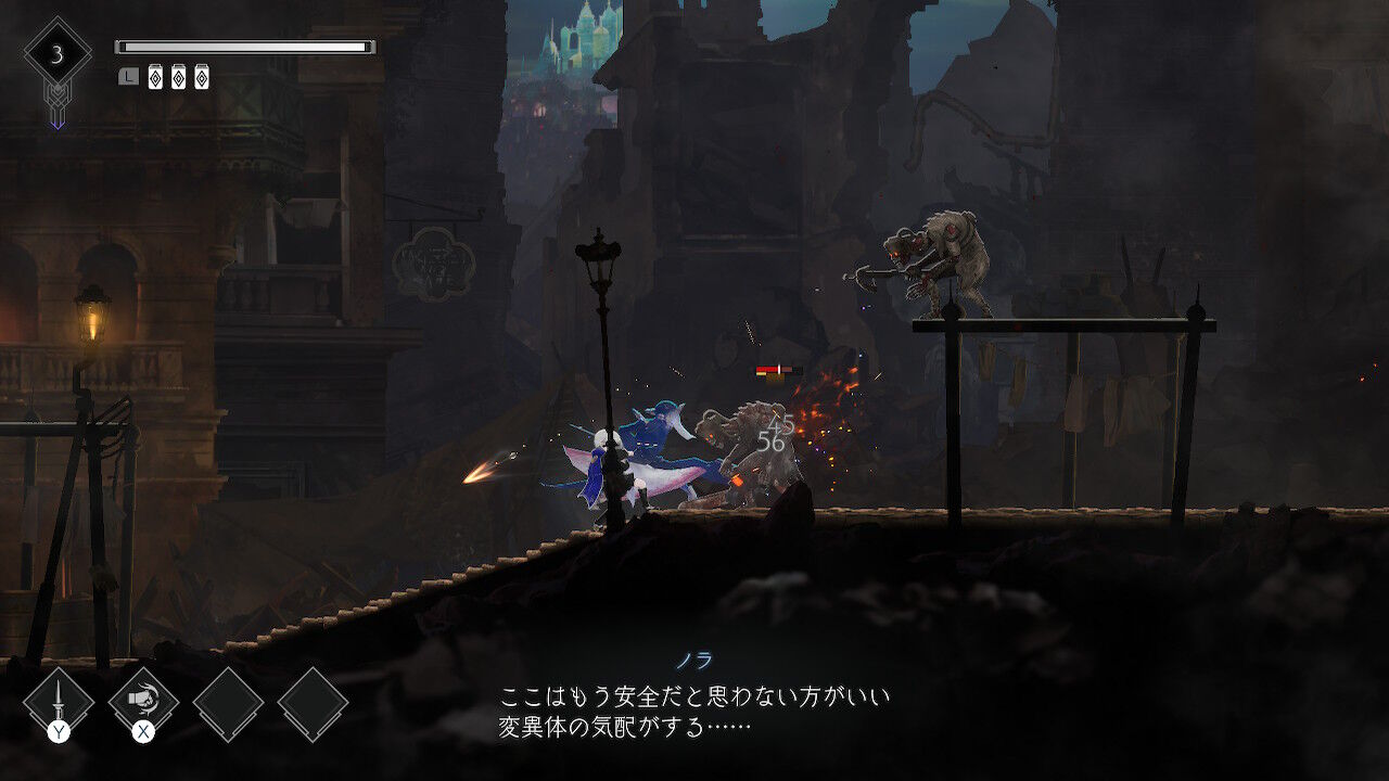 少し進むと、メインスキルである「ノラ」をゲット。ボタン連打でコンボ攻撃を繰り出せます