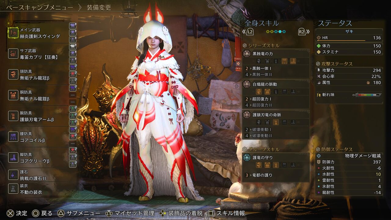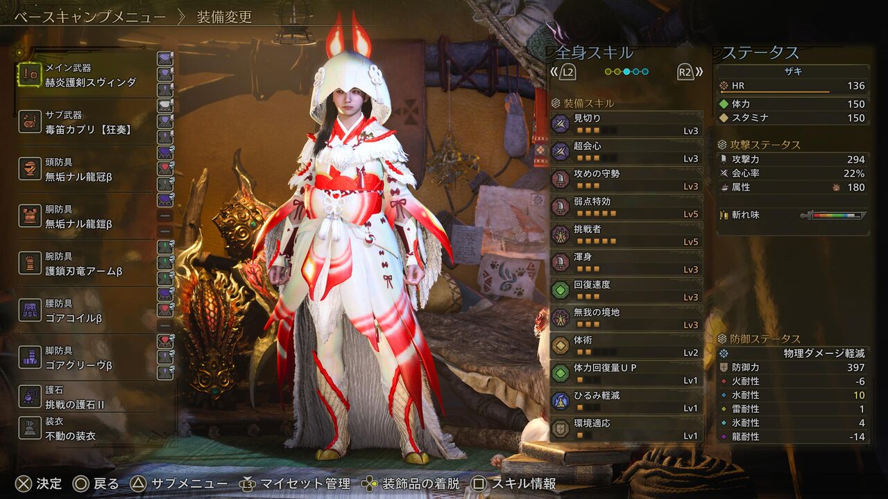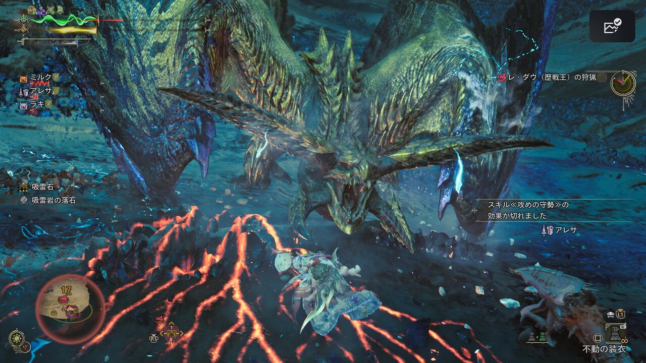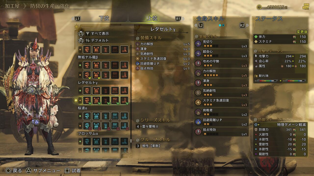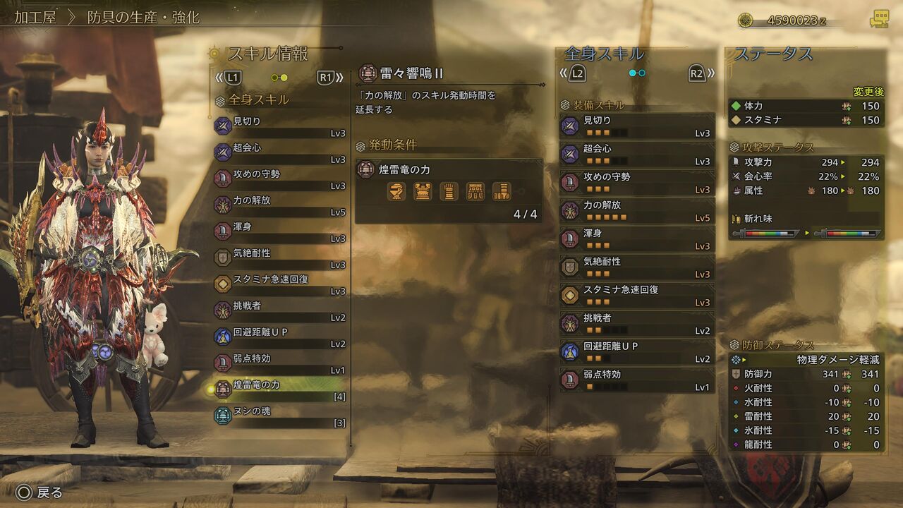 ちなみに僕が今回、歴戦王レ・ダウを狩猟した際のスキルはこんなカンジです。ゾ・シア装備を2部位、ゴア・マガラ装備を2部位、アルシュベルド装備を1部位ってカンジ