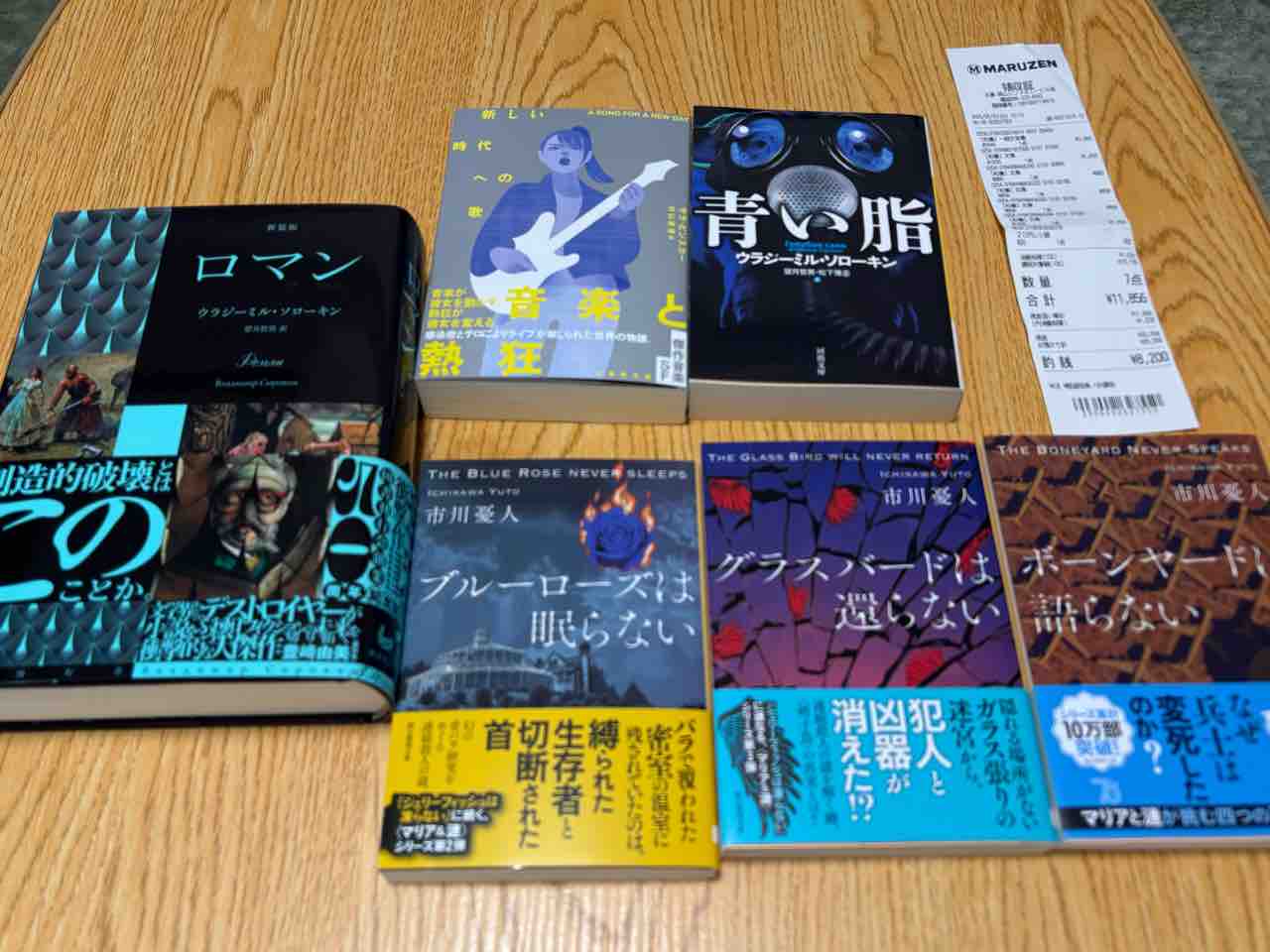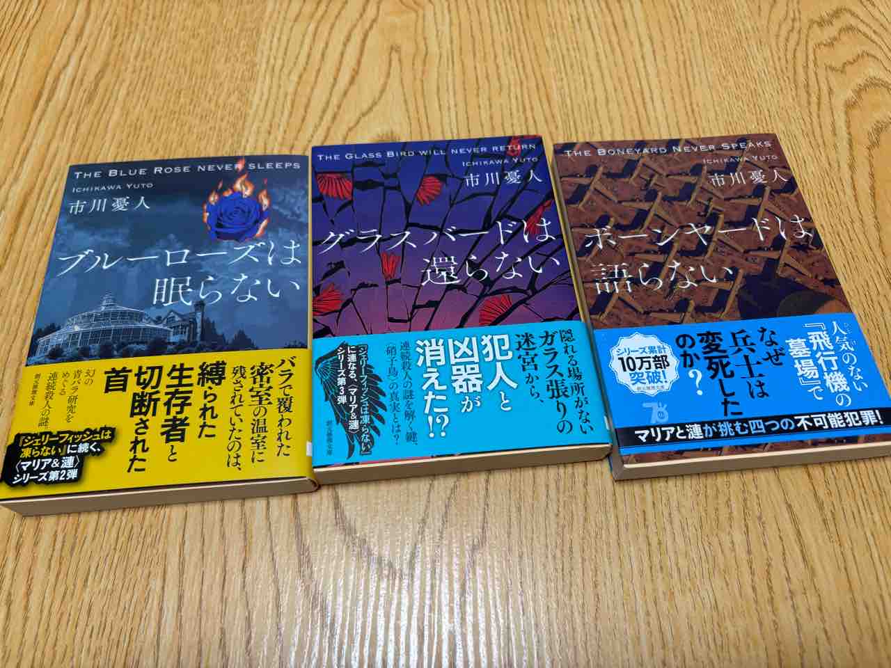 あとは市川憂人の「ブルーローズは眠らない」「グラスバードは還らない」「ボーンヤードは語らない」の3冊。「ジェリーフィッシュは凍らない」のシリーズ作品だよ