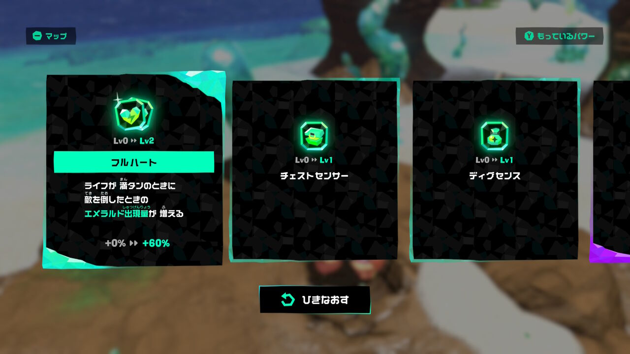 得られるエメラルドが増えたり、化石の位置が分かったり・・・様々なパワーアップがあります。ローグライトっぽいシステムですよね