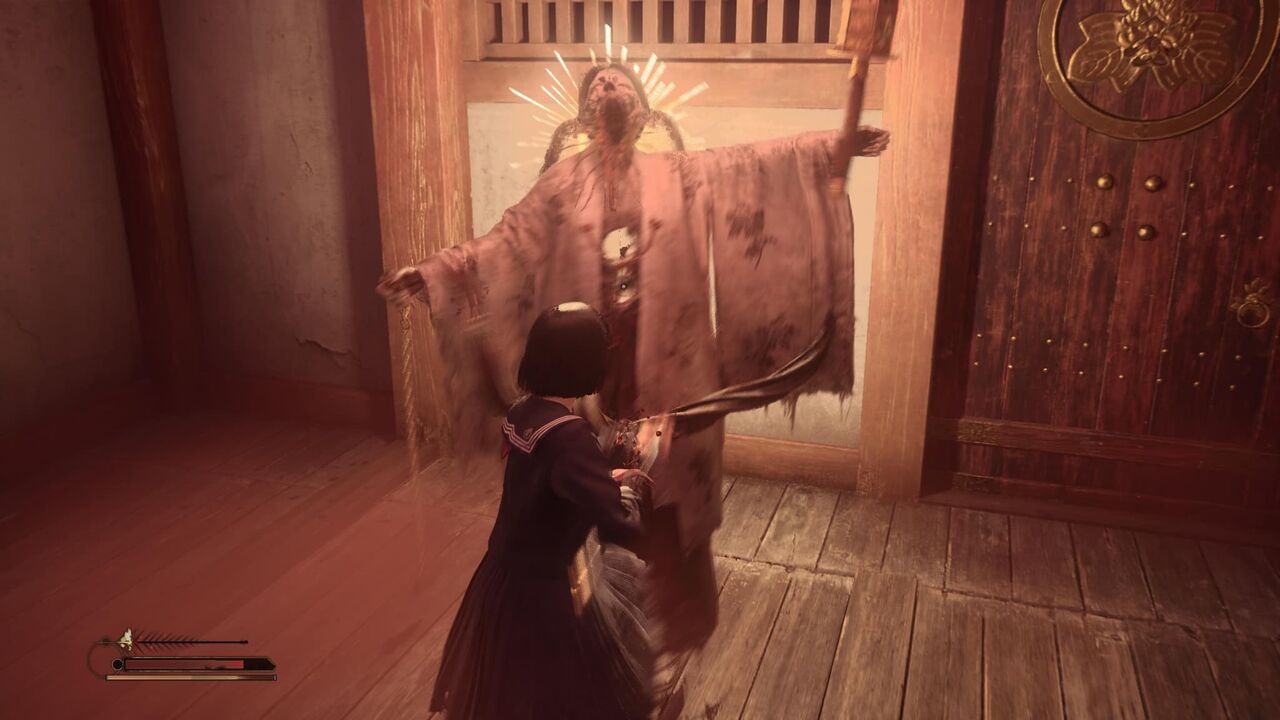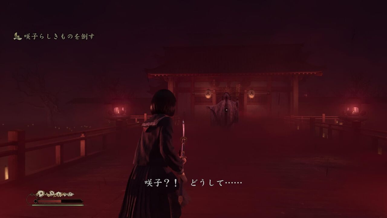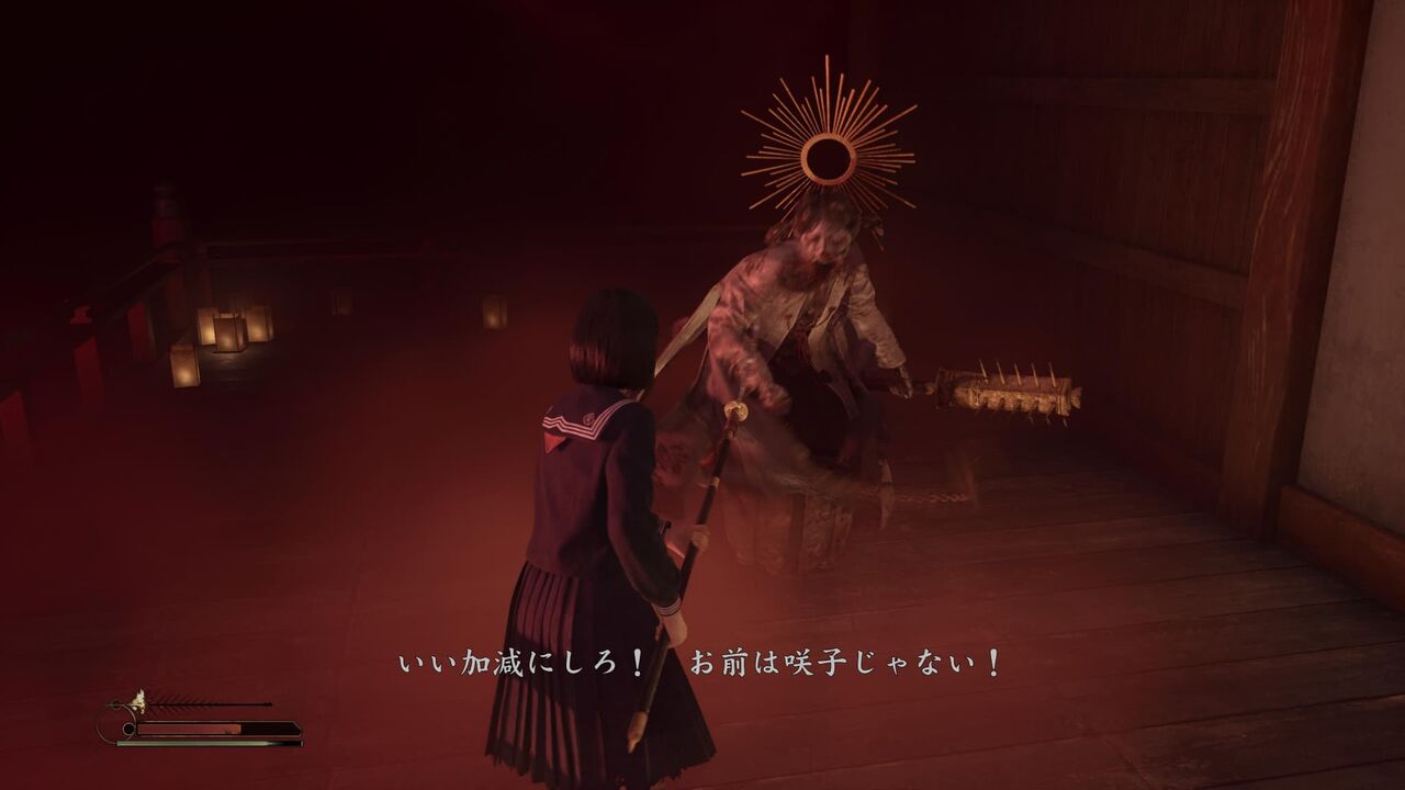 咲子は掴み攻撃や、こちらにホーミングしてくる鎖鎌めいた武器を繰り出す難敵!手持ちの包帯をほとんど使わされながらも・・・隙をみて薙刀をぶっ刺していくぞ!