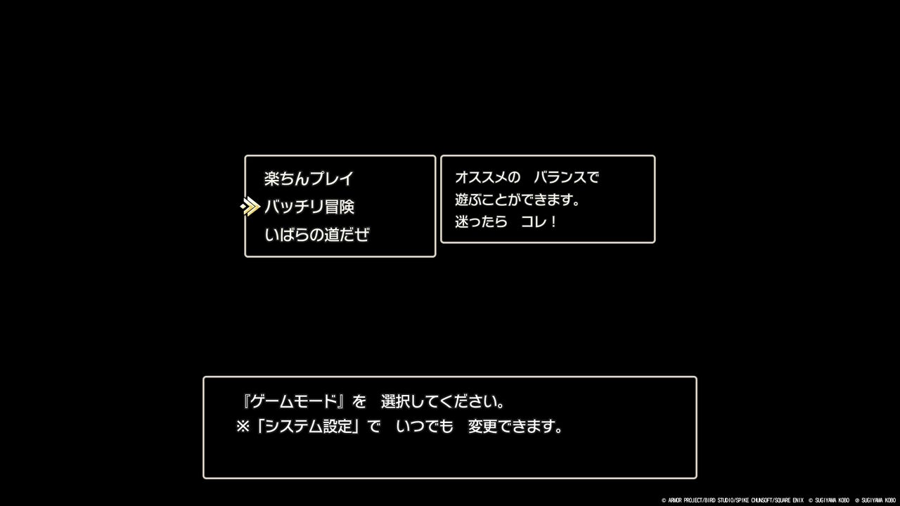 ゲームモードは「楽ちんプレイ」「バッチリ冒険」「いばらの道だぜ」の3種類から選択可能。プレイ中自由に変更できるので、とりあえず「バッチリ冒険」を選んではじめるね
