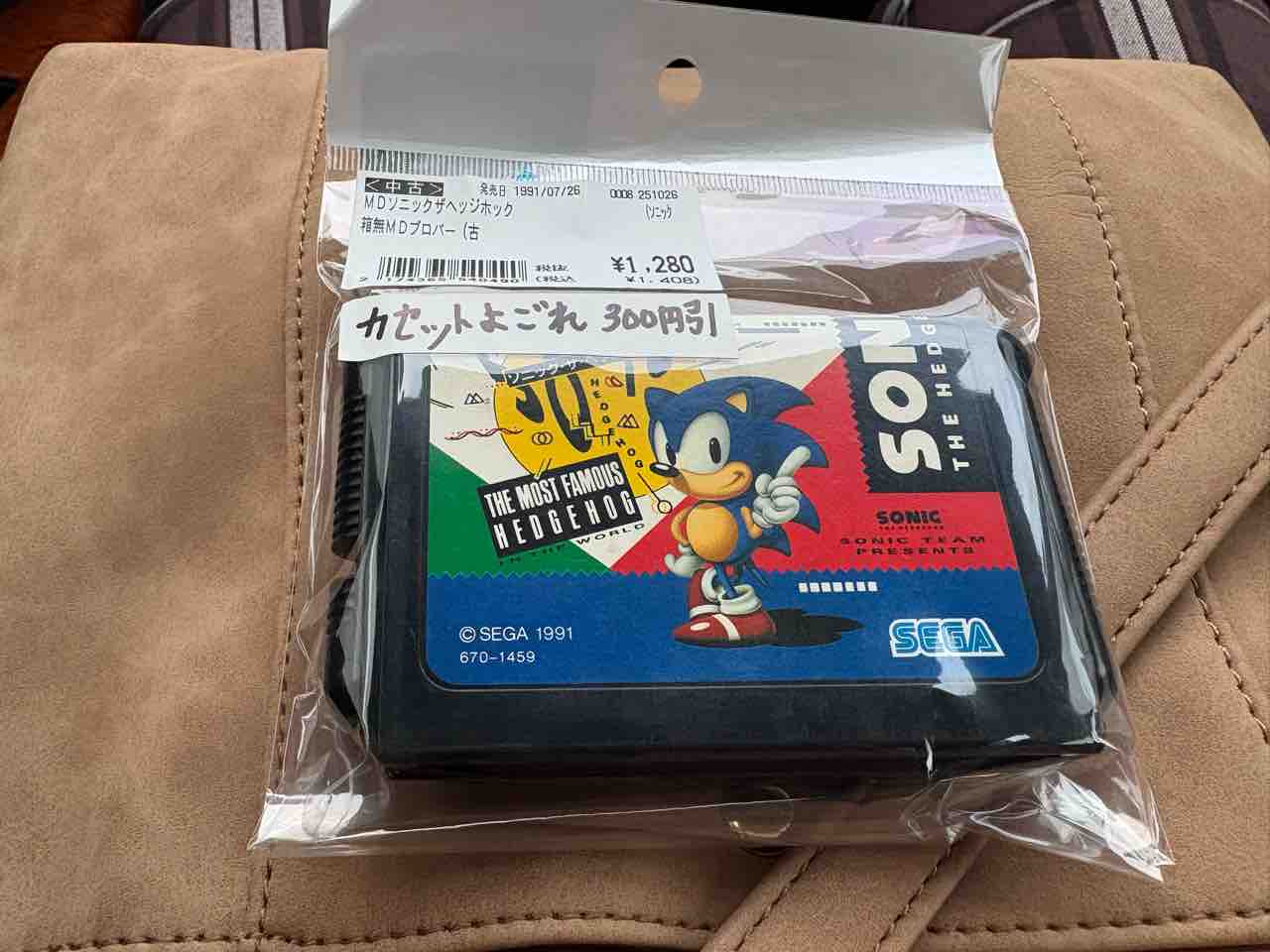 実は恋人と一緒に行ったんだ。彼の思い出のタイトルだったメガドラ『ソニック・ザ・ヘッジホッグ』を何店舗か回って探してて・・・4店舗目ぐらいでやっと見つけたわけ!なので、一緒にお会計した次第です